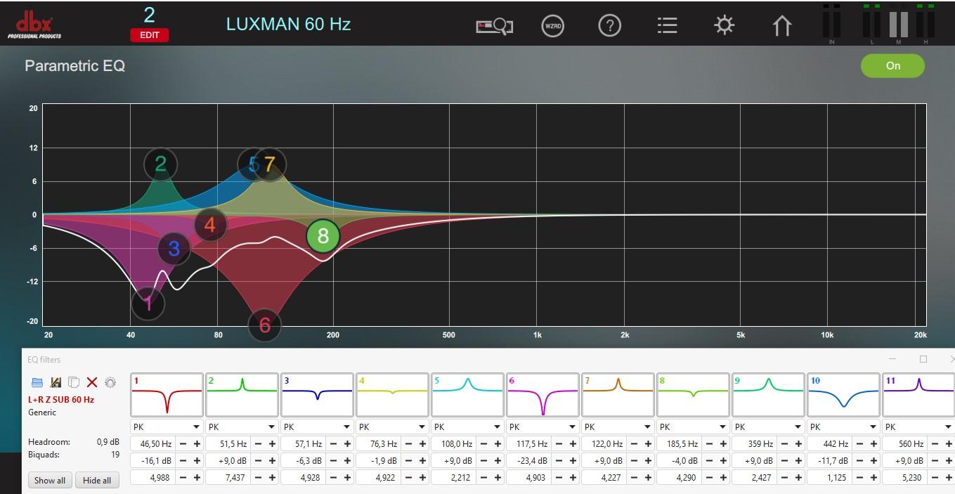Zrobiłem , jest dobrze. Wbiłem opóźnienie suba o 2 ms i jakoś bardzo słyszalnej różnicy nie dostrzegam , może to wiek Zobaczymy co wyjdzie na pomiarach . Pobawiłem się EQ i jest fajnie. Wygenerowałem filtry z Rew i wbiłem osiem do EQ / zdjęcie 1/. Nie da się słuchać. Zrobiło się cholernie płasko bez duszy. Ograniczyłem ilość filtrów do pierwszych pięciu / Zdjęcie 2/ czyli max. do pasma 108 Hz i jest naprawdę elegancko. Powietrze , energia wróciła.