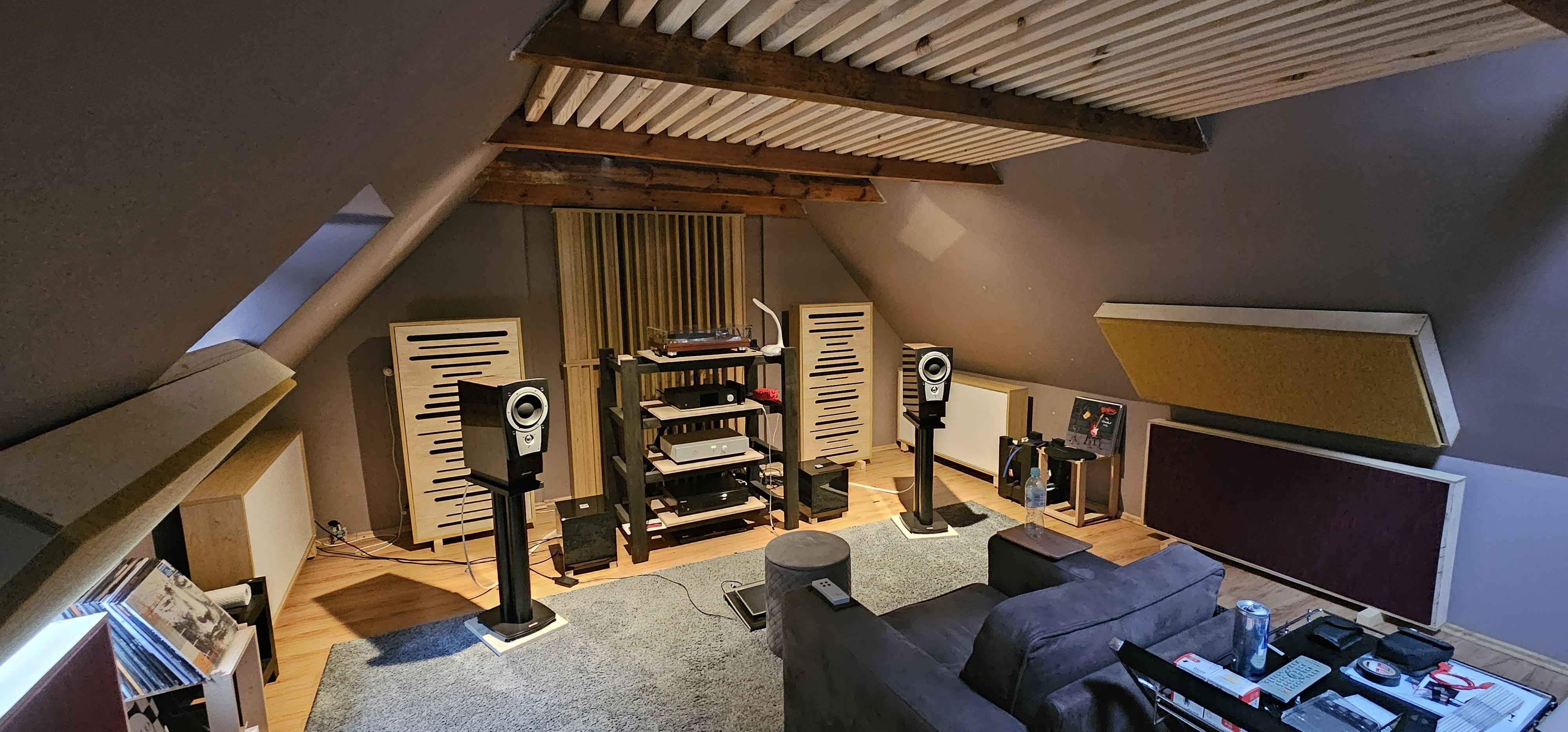 Akustyka zmienia wszystko w pokoju odsłuchowym jednak trzeba mieć w tej zabawie jakiś umiar . Ostatnio dużo zrobiłem dobrego dla mojej jaskini Chmura ( wymiar 2x2 metra nad nią wata PT80 i przerwa od waty do sufitu 75cm ) tutaj zadziało się najwięcej wokal stał się namacalny , dużo powietrza , świetna separacja , ogólnie czułem , że w pokoju nie muszę już nic robić bo jest naprawdę ogromna poprawa Pułapka basowa membranowa strojona pod 55hz skończyło się dudnienie poprawiła się klarowność bas czysty punktowy słychać więcej detali bas już tak nie przykrywał reszty pasma Pułapka szczelinowa o wymiarach 120x60 x17cm w środku wata PT80 grubość 10cm wszystko odstawione od tylnej ściany na 25cm co się poprawiło przede wszystkim wokal dostał więcej mięsa więcej powietrza jest rewelacyjny czuć punktualność w basie wrażenie jest świetne Miejsce pierwszych odbić wata PT80 w skrzyni od waty do ściany przerwa 10cm ( tutaj zostały zmienione panele 2D czy słusznie tak do końca nie wiem ) co się na pewno wydarzyło scena się zmniejszyła na boki ale stała się precyzyjniejsza co może też mieć wpływ na wokal ( uwielbiam prawdziwość wokalu ) Za plecami hybryda panel PT80 na nim panel binarny po bokach panele 2D jest dopełnienie wszystkiego muzyka nie fruwa za plecy ale czuć , że pokój stał się większy Ogólnie wszystkie zmiany poprawiły akustycznie pokój to się słyszy tam chce się siedzieć słuchać. Zapewne można jeszcze coś poprawić ale nie dziś i nie jutro może za jakiś czas teraz czas na relaks.