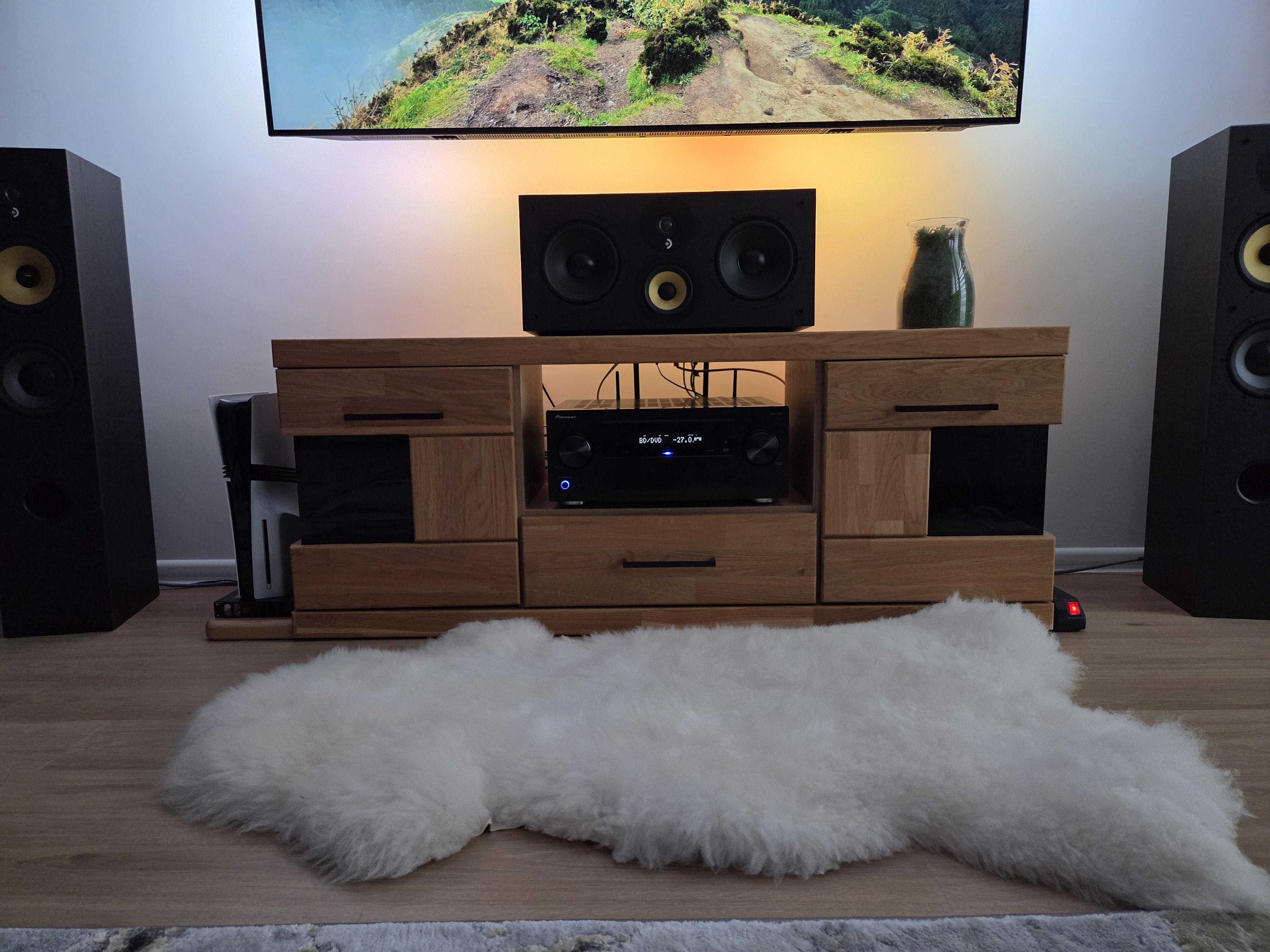 10. Mało takich przypadków miałem. Trafiają chyba do producenta, bo wychodzi na to że sprzęt stał się wadliwy już na etapie produkcji, jeśli klient wykrył usterkę od razu po zakupie. Najpierw sprawdziłem MCACC, a potem Dirac. Bez porównania! Dirac naprawdę robi robotę niesamowitą. Odkrywam atmos na nowo. Obecnie tak mam wsadzony AVR. Estetyka na tym ucierpiała. No ale nie widzę innego rozwiązania. Kable z tyłu pięknie podświetlone przez ambilight...