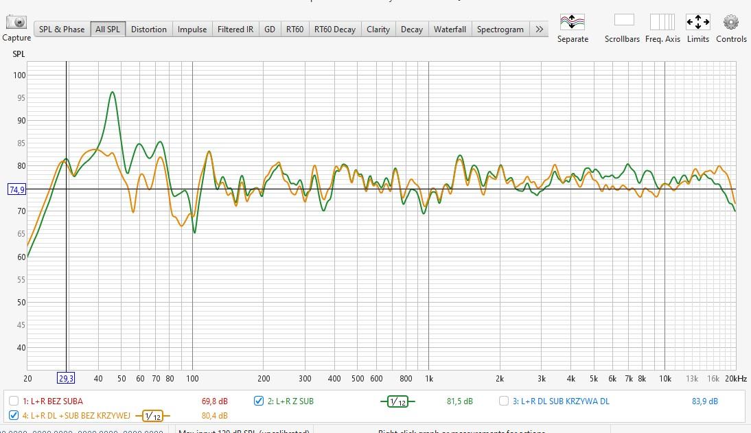 A jak już poruszyliśmy temat emocji , to całą noc nie spałem zastanawiając się czemu , krzywa DL przez te wszystkie lata podbijała niskie o 3-4 dB , a tu nagle 10-11 dB. Od samiutkiego rana wziąłem się za mój system klocek po klocku sprawdzając co może być przyczyną. I znalazłem ! @MariuszZ , @lpomis przepraszam , za wcześniejsze pomiary. W RME , choć dałbym sobie rękę uciąć , że wyłączałem , włączone były filtry te co to wklepałem z Rew. Na moim przykładzie zatem można przyjąć , że pomiary się do czegoś jednak przydają , bo pokazują ewentualne błędy w ustawieniu systemu. Zrobiłem kolejne pomiary dla DL , a następnie wszystko REW-em od początku. - L + R bez subwoofera - L + R z subwooferem - L+R z subwooferem i filtrami DL oraz krzywą DL czyli tak jak słucham na codzień - L+R z subwooferem i bez krzywej domowej DL / zdjęcie w załączniku/ jak dla mnie wygląda to o niebo lepiej , ale wszelkie sugestie mile widziane. POMIAR 30.11.25.mdat