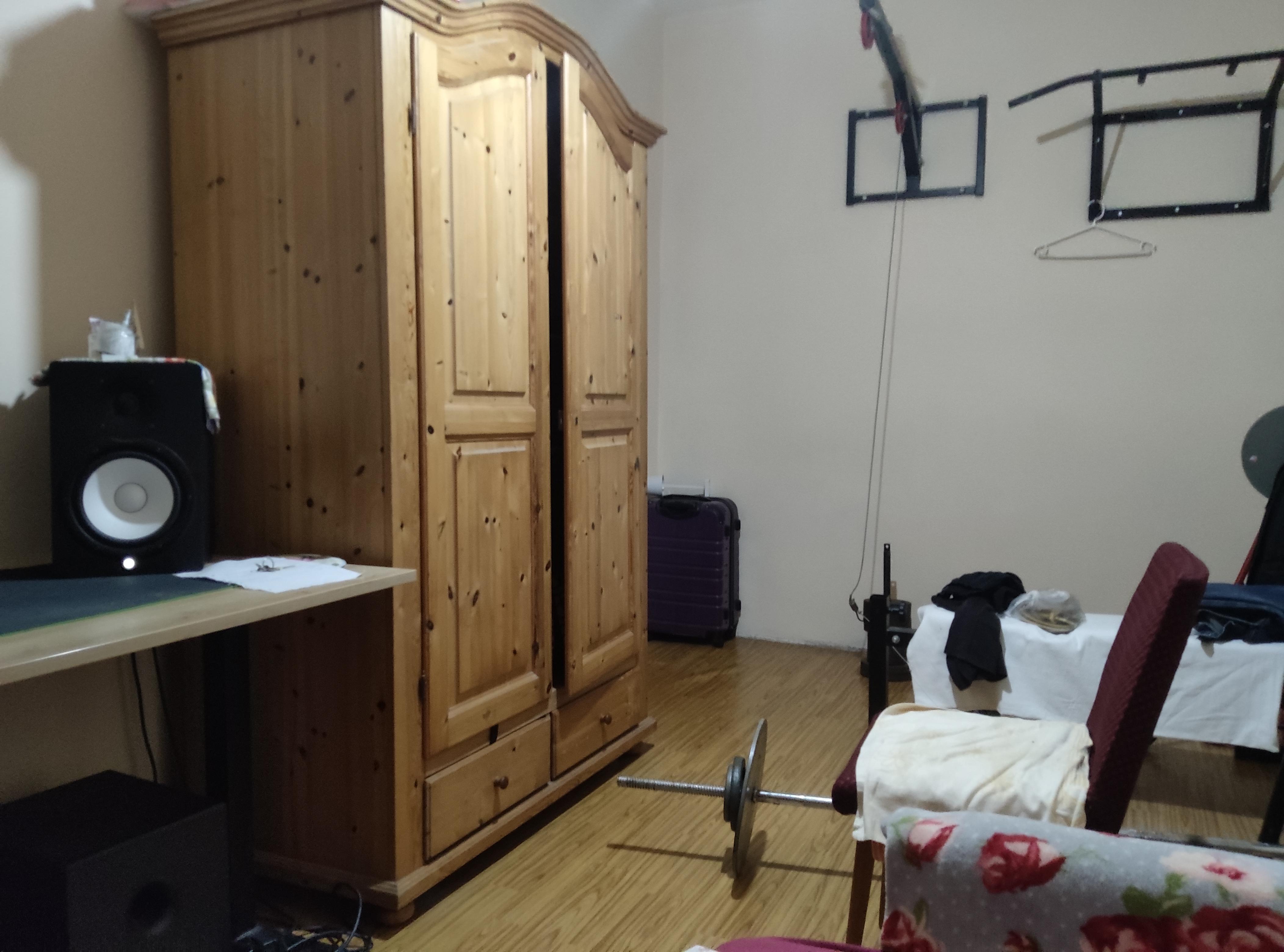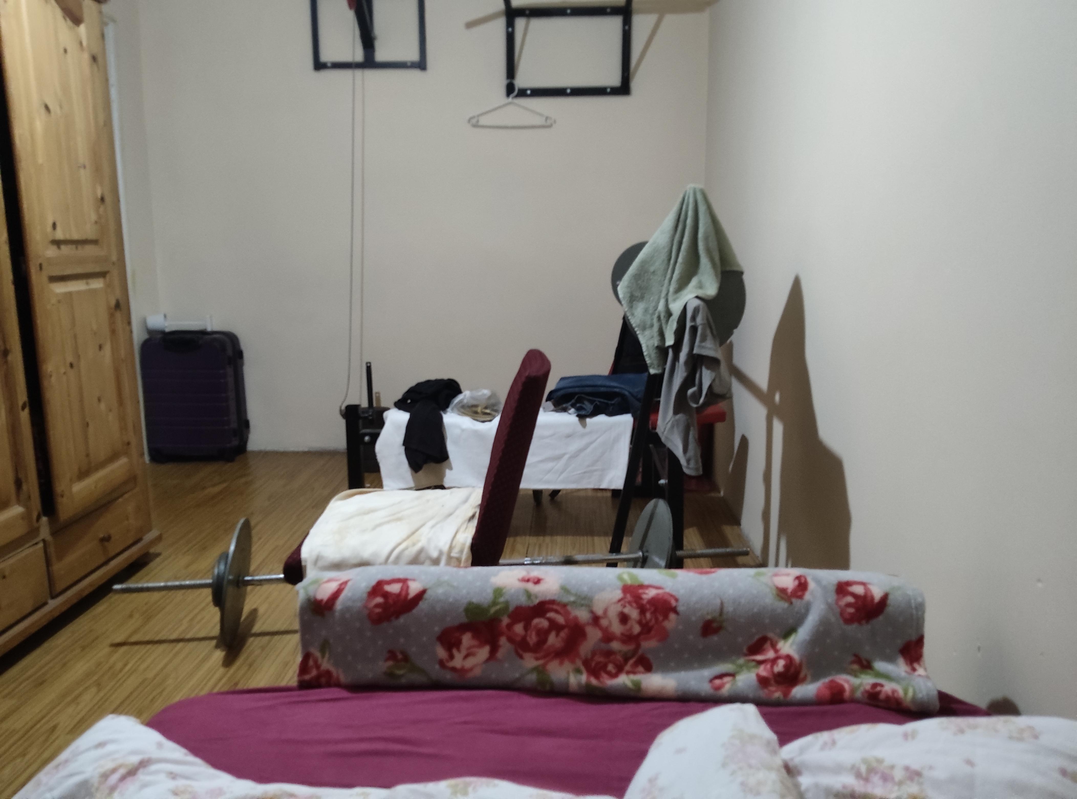 Pokoj nieduzy w ksztalcie prostokątu, który dzielę na dwa kwadraty jedna czesc do cwiczen, druga czesc lozko, komputer -