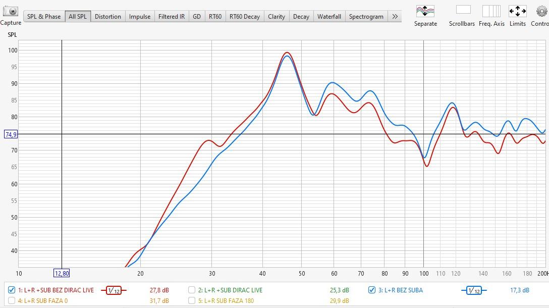 Zrobiłem dzisiaj pomiar kolumn z subem z filtrami Dirac Live i bez. Widać jak Dirac łagodzi mod pomieszczenia. To dzięki temu mogę dać parę oczek głośniej na subie i nadal nie powoduje to dudnienia. Te filtry to jakieś odniesienie do filtrów które zamierzam stworzyć REW-em. POMIAR 1 27.11.25.mdat