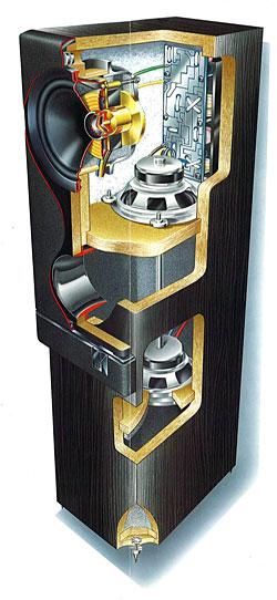 Mam trochę podobnie w KEF 107. Wylot, za to, skierowany pionowo do góry. Po dwa 25 cm niskotonowce zespolone i połączone współśrodkowo prętem.