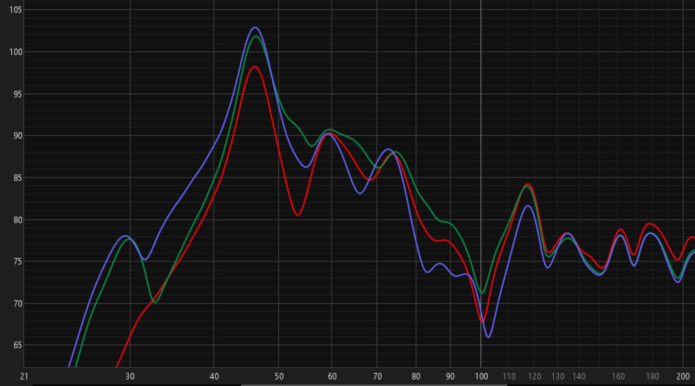 Teraz pomiary wydają się być ok. Są bardzo zbliżone do poprzednich Nie gniewaj się Tomek, ale to nie wygląda dobrze pod kątem współpracy kolumn z subem. Niezależnie od ustawionej fazy sub wyraźnie pompuje główny mod pokoju. Dołek ~85Hz i powyżej tylko lekko się rusza, a samo rozciągnięcie basu jest małe, tych najniższych częstotliwości prawie nie ma. A to w końcu duży Rel T9/x. On na bank potrafi tam dołożyć. Trzeba kombinować z miejscem na suba i gałkami. Bez DSP też się nie obejdzie. ■ - same kolumny ■ - z subem (faza 0) ■ - z subem (faza 180)