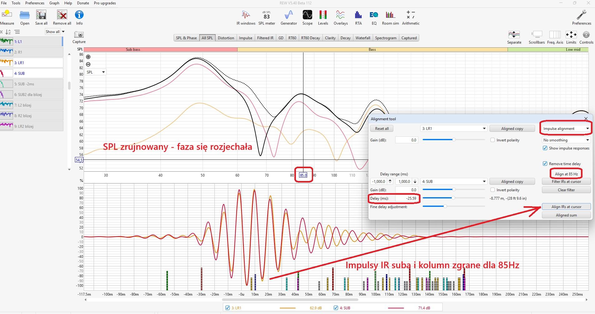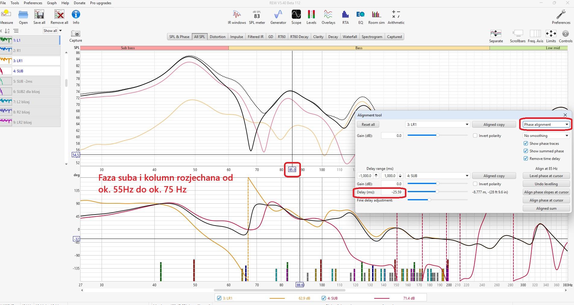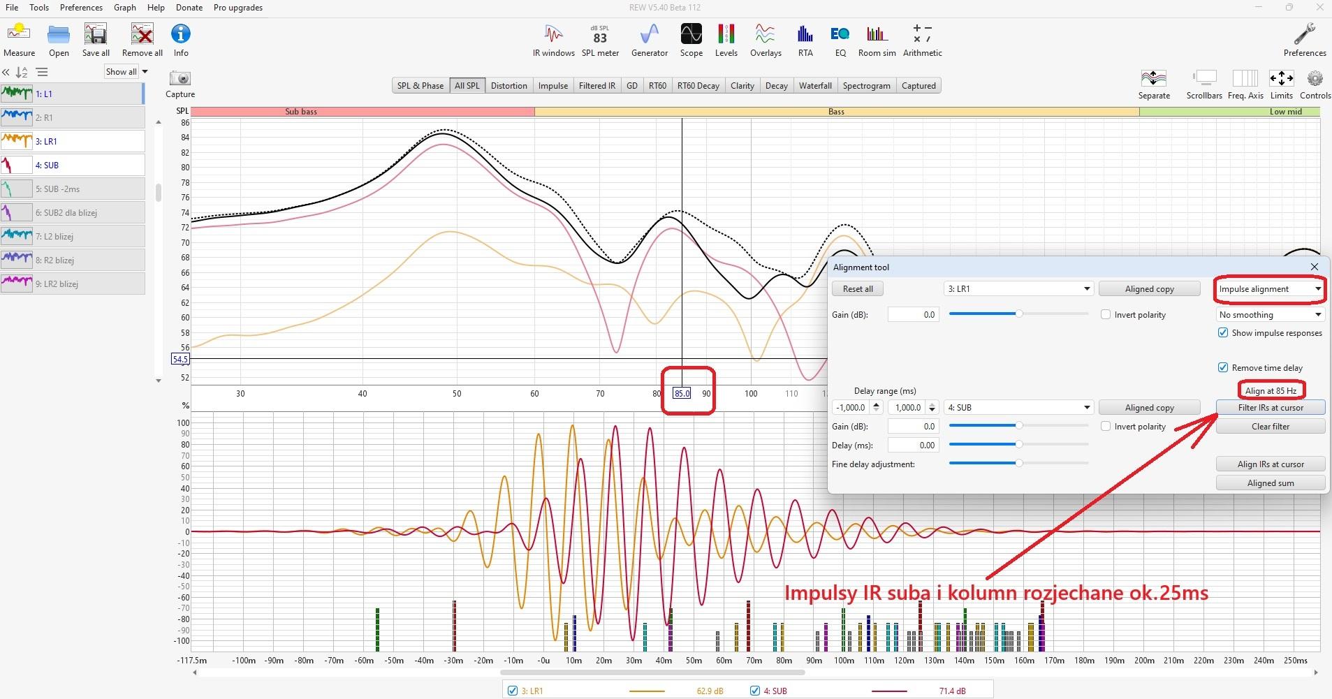 Dziurę to masz do 60Hz z tego co widzę na Twoich pomiarach. Chłopie tak jak potrafię. pewnie nie gorzej od Ciebie Niby iść na koncert i szybko do domu zanim zapomnę żeby suwać subem szukając zgrania? Litości, ale nie zniechęcam. Każdy orze jak może. Są lepsze metody. Stopa o ile mnie pamięć nie myli 80-90Hz plus alikwoty i jak sub będzie rozjechany z kolumnami to raczej to usłyszysz bez konieczności porównywania z wzorcem. REW pomaga przeanalizować krok po kroku pomiary i wiedzieć gdzie mamy problemy by móc z nimi powalczyć. Na przykładzie moich pomiarów. Analizujesz 85Hz na przykład bo 80-90Hz to podstawa stopy. Patrzymy na pomiary i wszystko widzimy. Rozjechane. Chcemy idealnie zsynchronizowany sub z kolumnami dla stopy 85 Hz to klikamy "Alignment IRs at cursor" i widzimy ile opóżnienia trzeba dostarczyć do suba lub kolumn (ok.25ms). Oczywiście żeby nie było lekko jak zsynchronizujemy dla jednej częstotliwości to dla innej może się rozjechać, to samo z fazą i SPLem bo to naczynia połączone i trzeba spoglądać na całokształt. Tip. Żeby zobaczyć IR suba i kolumn potrzeba w oknie "Alignment tool" kliknąć "Filter IRs at kursor" dostosowując skalę dla konkretnej częstotliwości. Zabawa dla prawdziwych hobbystów Wspaniała zabawka, ale czy trzeba aż tak mocno gonić za doskonałym dźwiękiem komplikując muzyczne seanse? Tomek, to nie apteka. Odradzam