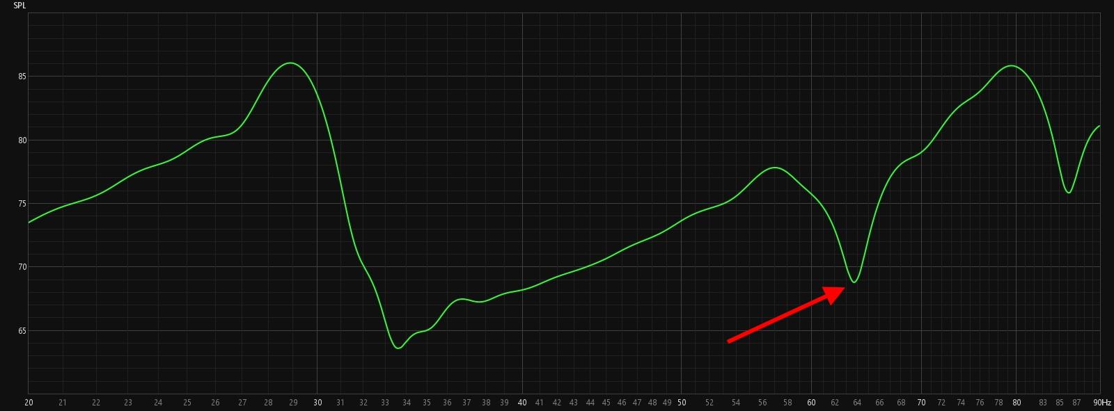 A masz jakieś wypełnienie w ścianie za kolumnami? Pianka, wełna lub coś innego przez co przenikają fale dźwiękowe? Myślę, że to jest tutaj kluczowe. SBIR liczy się od miejsca, gdzie bas faktycznie się odbija, a nie od tego, co widać gołym okiem. Jeśli ściana jest "miękka", odbicie może być dalej. Pierwszy, najgłębszy dołek SBIR możemy wyliczyć wg prostego wzoru: f = c / (4 * d) f -> częstotliwość dołka c -> prędkość dźwięku (przyjmujemy 343 m/s) d -> odległość przedniej ścianki obudowy (centrum membrany głośnika) od ściany Poniżej wycinek z Twojego pomiaru. Jeśli masz więc odsunięte kolumny od ściany na 115cm, a w niej jest jakaś miękka zabudowa na kilka-kilkanaście centymetrów to wszystko może się zgadzać. Dołek wypada na 64Hz.