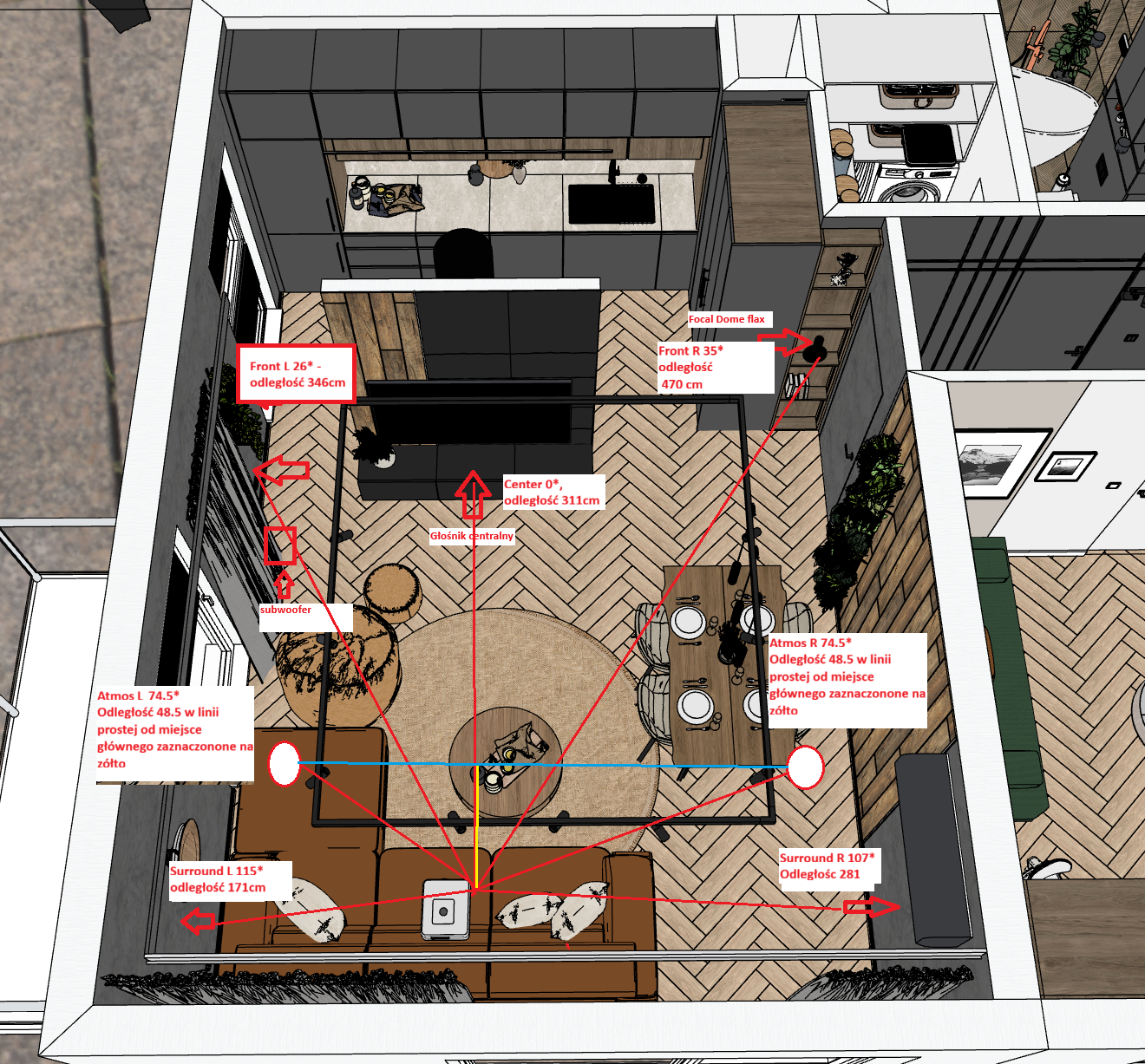 Hej, potrzebowałem troche czasu, żeby ogarnąć terminologie itp... co by Was nie dopytywać o głupoty... Co już w sumie miało miejsce. Do rzeczy, porobiłem w maire dokładne wymiary mojego rzeczywistego ułożenia. W związku z tym, że raczej kanapy nie jestem w stanie przesunąć ponieważ zablokuje sobie otwieranie drzwi balkonowych. Więc z ułożenia 5.1.4 chyba musze zrezygnować. Ponieważ z tyłu osiągne max 100* przy obecnym ułożeniu kanapy... Dodatkowo musiałbym Przednie atmosy przenieść na odległość 175 cm od kanapy(to by się jeszcze dało zrobić), ale z takimi kątami czy jest sens? Czy iść w ułożenie 5.1.2, moje ułożenie(usuwając głośniki z szafki TV troche to przypominają) czy kąt 74.5* atmosów byłby akceptowalny? Co byście mi doradzili? Na ile moje aktualne ułożenie pod 5.1.2 jest akceptowalne z Waszego doświadczenia?