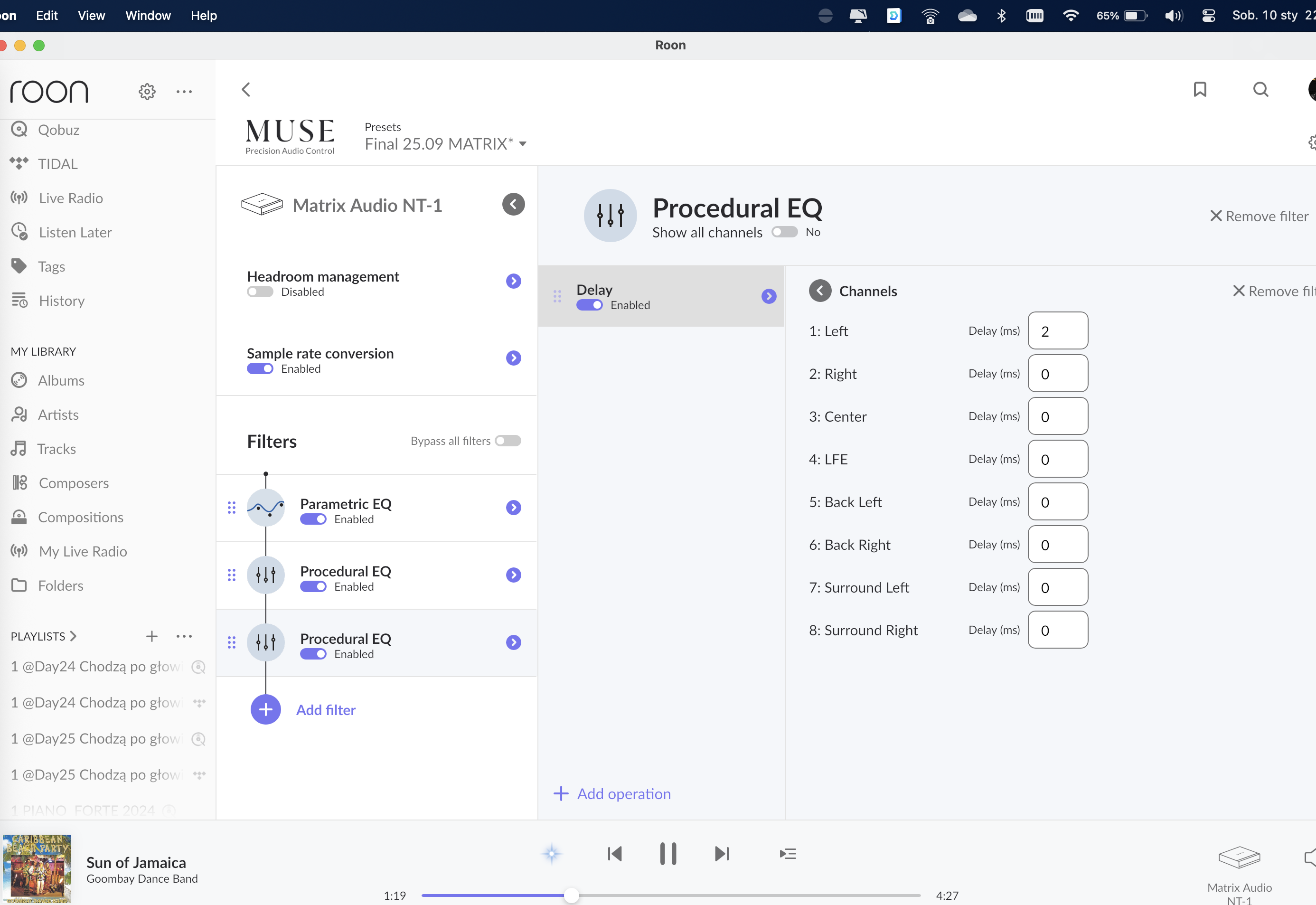 Cześć Tomek, a Roonem nie myślałeś żeby skorygować sobie opóźnienia na kanale. Tam masz możliwość mega precyzyjnie w ms ustawić opóźnienie każdego kanału + masę innych wynalazków. Ja kiedyś bawiłem się kilkoma hardwarowymi DSP w przedziale 6-18 tyś PLN i ostatecznie wszystkie posprzedawałem lub oddałem gdy mogłem.... i wylądowałem z Roon i jestem megazadowolony z tej inwestycji. Załatwia mi wszystkoc co sobie wymyslę... a fantazji mi nie brak do "cudowania" hi hi Pozdrawiam. M. Obecnie używam do krekcji pasma (stopniowa krzywa) między 8300 -14000 Hz w lewym kanale wzmacniając 2-3 db Ponieważ mam niestety lewe ucho słabsze o te kilka decybelii w tych wyższych częstotliwościach. po to kupowałem i cudowałem z DSP między innymi i tu mi ROON to pięknie załatwił bo można na każdym kanale niezależnie , korygiować krzywą a nie tylko na obu na raz - to ważne ! + czasami jak czuję potrzebę załączam DSP korygujące mi to co chcę w przedziałach wybranych np odcięcie poniżej 35 Hz w lewo do zera , wzmocnienie wokalu pasma, lekko itp itd ale generalnie słucham z minimalną korekcją tylko odcięcie samego dołu pon 35 Hz no i ucho Acha , jeśli zasłony i pochłaniacze wyższych zakupisz a masz problem z pogłosem w niskich to jeszcze bardziej powiekszy Ci się problem. Tylko grube absorbery z wełny lub pułapki basowe, ja sobie po woli wiele części pokokoju wyposażyłem w tłumiące elementy ale tylko niskich bo wysokie i tak wiele absorberów mi tłumi " bez łaski" Jedyne miejsca gdzie nie użyłem wełny a pianki akustycznej ale takiej która maksymalnie łapie niskie to są wnętrza dwóch kanap (żeby nie pyliła wełna) - to jedyy wyjątek w moim pokoju audio. salonie. To tak do rozważenia.