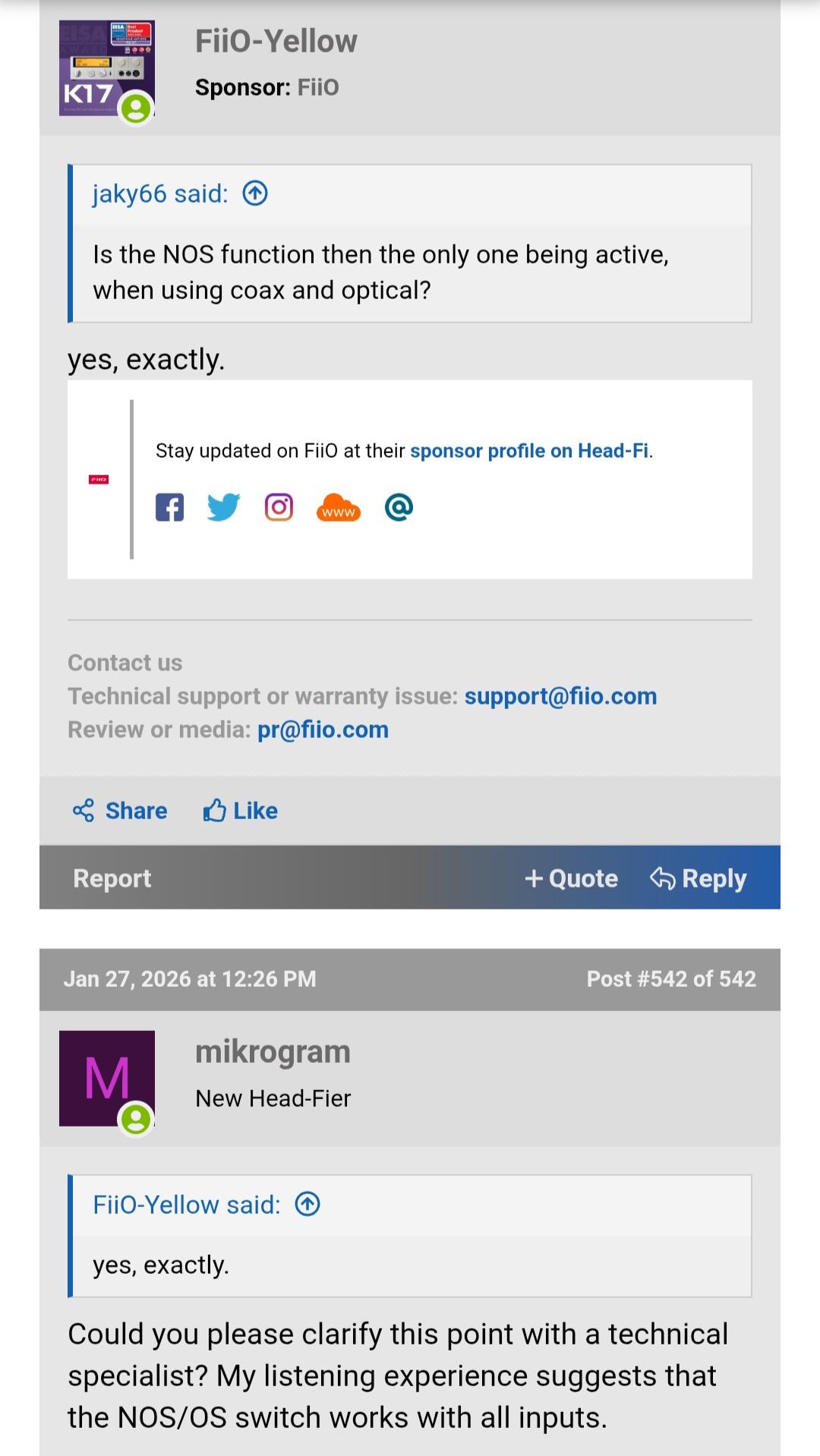 Otrzymałem odpowiedź z Fiio : " Dziękujemy za kontakt z FiiO! Cześć, funkcje NOS i OS działają tylko w trybie dekodowania USB. Jeśli masz jakiekolwiek pytania lub wątpliwości, daj nam znać, a my chętnie pomożemy. Miłego dnia! Z wyrazami szacunku, Obsługa klienta FiiO Lin Lin Numer zgłoszenia to 60177. Prosimy o uwzględnianie go we wszystkich wiadomościach e-mail. "