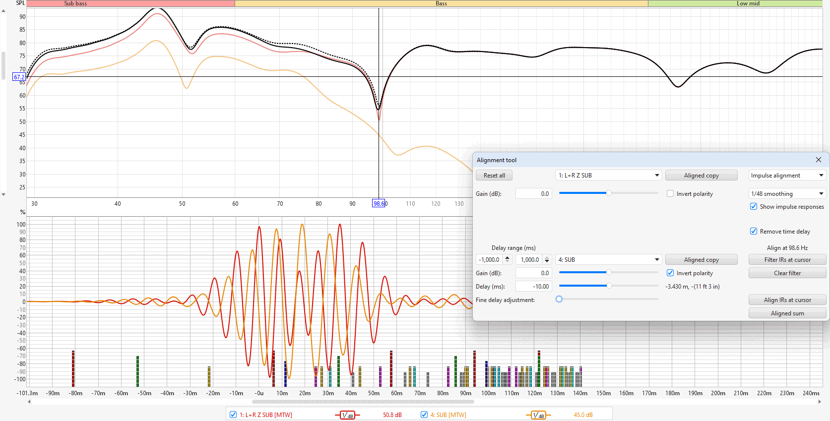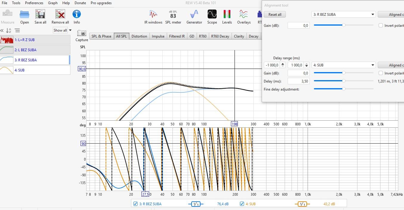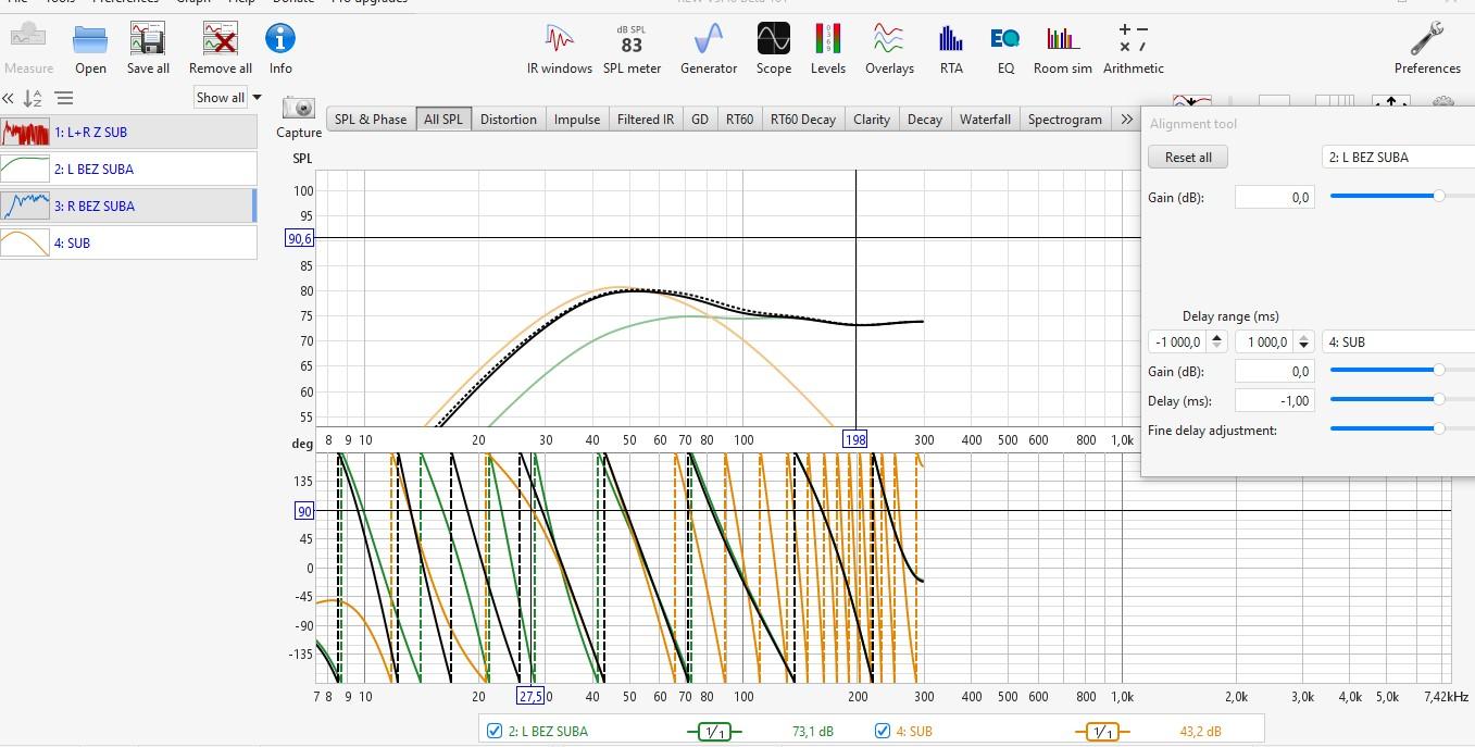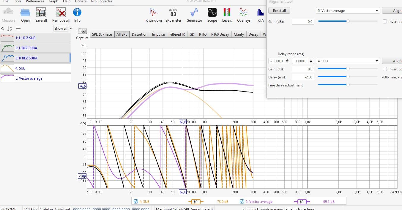 Tak był podczas pomiaru crossover na 60 Hz. Wątek ' Pomiary REW" na coś się przydał bo znalazłem podaną przez Ciebie metodę. Zrobiłem wyrównanie do tej czarnej przerywanej linii i wyszło tak jak na zdjęciach. faktycznie nie zrobiłem pomiary obu kolumn bez suba. Wyciągnąłem więc " vector average " z lewej i prawej bez suba. Wyszło - 2 ms. Do sprawdzenia.
