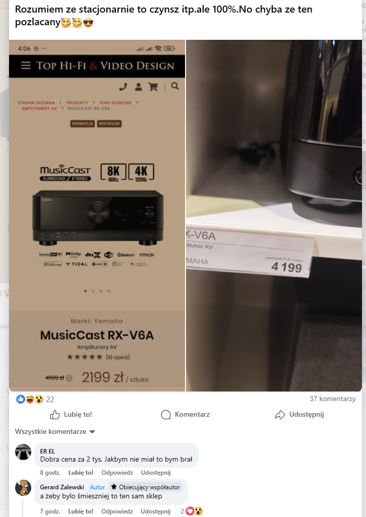 Dlaczego nieprawdziwe? Dzisiaj na fb pojawił się taki post: W komentarzach pojawiają się informacje, że salon nie chciał schodzić z ceny na półce. Oczywiście jest ile ileś komentarzy, w których użytkownicy twierdzą, że cena jest weryfikowana z tą na stronie, ale sam doświadczyłem u Was obu podejść. Wyobrażam sobie sytuację gdy ktoś wejdzie z ulicy i nie zweryfikuje cen online, bo obawia się zakupów w sieci i weźmie ewentualną różnicę na klatę jako koszt preferowanego przez siebie zakupu stacjonarnie. Kolejna kwestia, która jest cholernie irytująca (głównie dla początkujących przy pierwszym podejściu do zakupu sprzętu), to praktyczna niemożność weryfikacji na jaki sprzęt wystarczy założony na zakup budżet. Trzeba dzwonić by się dowiedzieć jaka jest cena poszczególnych elementów. Często przez telefon pada informacja, że jak się przyjedzie do salonu i będzie decyzja to wtedy dopiero porozmawia się końcowych cenach. Do tego jeszcze te ceny kolumn za sztukę... Człowiek robiący przymiarki ma mętlik w głowie. Sam przez to przechodziłem i pamiętam swojego Excela, w którym najwięcej niewiadomych miałem przy Waszej ofercie. U Was sporo zależy na kogo się trafi czy to przez telefon, czy nawet w samym salonie. Z jednym sprzedawcą da się konkretniej porozmawiać, drugi będzie sprawiał wrażenie, że nie wie czego od niego oczekuję. Rozumiem, że cena finalna będzie zależała od ostatecznego wyboru, ale te dane, które wrzucałem do Excela powinny być w miarę do ogarnięcia przez telefon. Jak już człowiek wejdzie głębiej w działanie tej branży to jest łatwiej rozmawiać nawet z tymi, którzy kiedyś potraktowali nas z oziębłą niechęcią. Jednak ci, którzy nie mają doświadczenia płacą "frycowe".