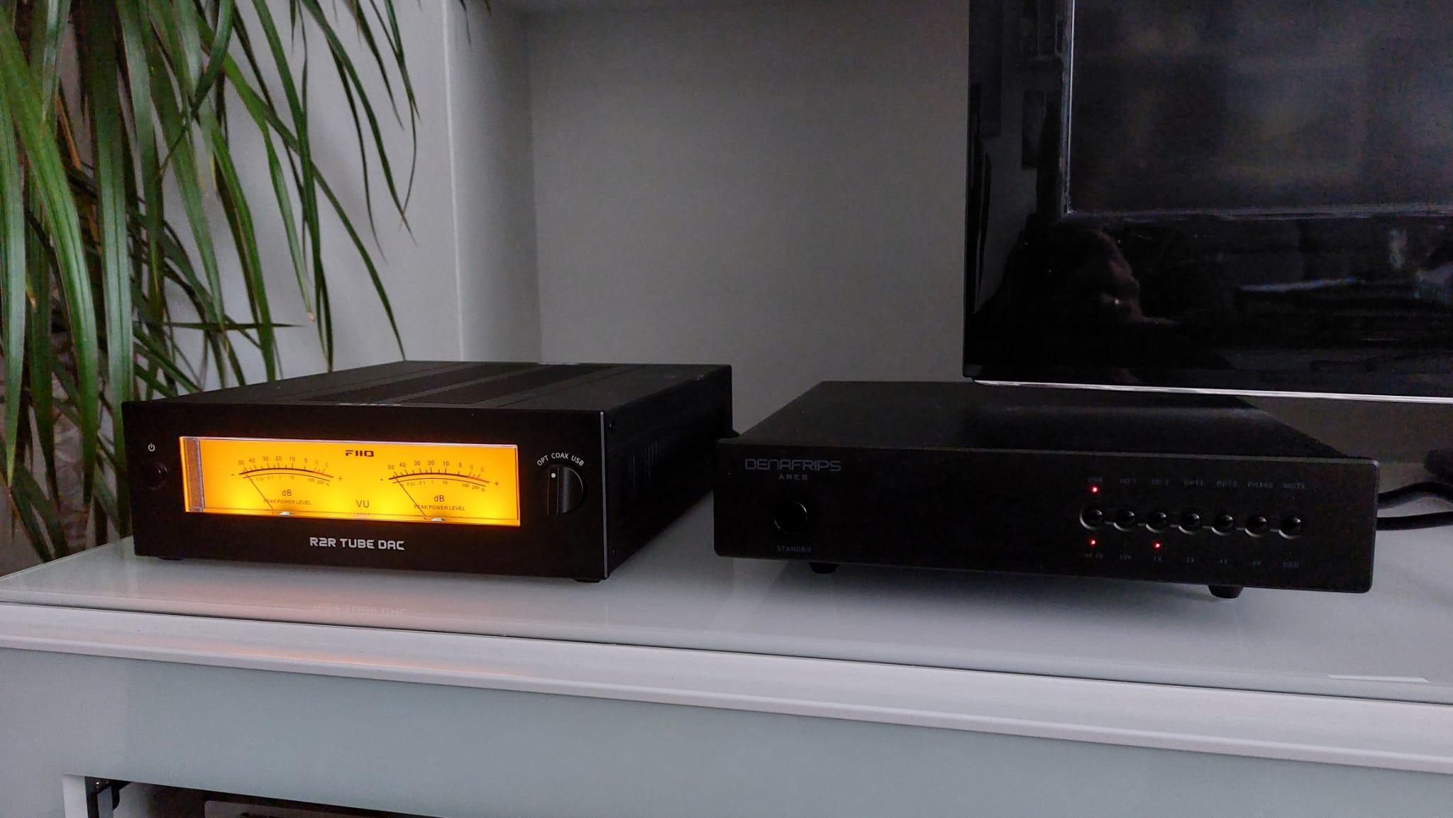 FiiO Warmer vs Denafrips Ares I Denafrips Ares I prezentuje dźwięk bardziej przejrzysty, dokładniejszy i precyzyjniejszy niż FiiOWarmer. Gra z wyraźnie większą werwą i energią, lepiej rysując krawędzie dźwięków i nadając im czytelniejszy kontur. Instrumenty oraz głosy są umieszczone w przestrzeni w sposób bardziej jednoznaczny i precyzyjny, co przekłada się na lepszą separację i klarowność przekazu. Scena dźwiękowa Aresa, w porównaniu do Warmera pracującego w trybie NOS, jest jednak wyraźnie węższa i mniej przestrzenna. Po przełączeniu Warmera w tryb OS sytuacja się zmienia, jego precyzja wyraźnie rośnie, ale scena ulega zmniejszeniu, stając się porównywalna, a momentami nawet nieco szersza niż w Aresie. W trybie OS w Warmerze bas, podobnie jak pozostałe zakresy, zyskuje na dokładności, twardości i mocy. Pojawia się więcej energii w dole pasma, poprawia się dynamika, ale ilość pogłosów i wybrzmień ulega znacznemu ograniczeniu. Zanika charakterystyczna ciepła otoczka, zmniejsza się wrażenie zamglenia i duszności. Mimo tych zmian Warmer wciąż nie osiąga poziomu dynamiki, przejrzystości i rozdzielczości prezentowanego przez Aresa. Podsumowując pół żartem, pół serio: Ares pod względem dynamiki i precyzji oferuje wszystko to, czego Warmerowi brakuje. Jednocześnie brakuje mu tej mitycznej, audiofilskiej „magii” i przestrzeni, którą potrafi wykreować Warmer.