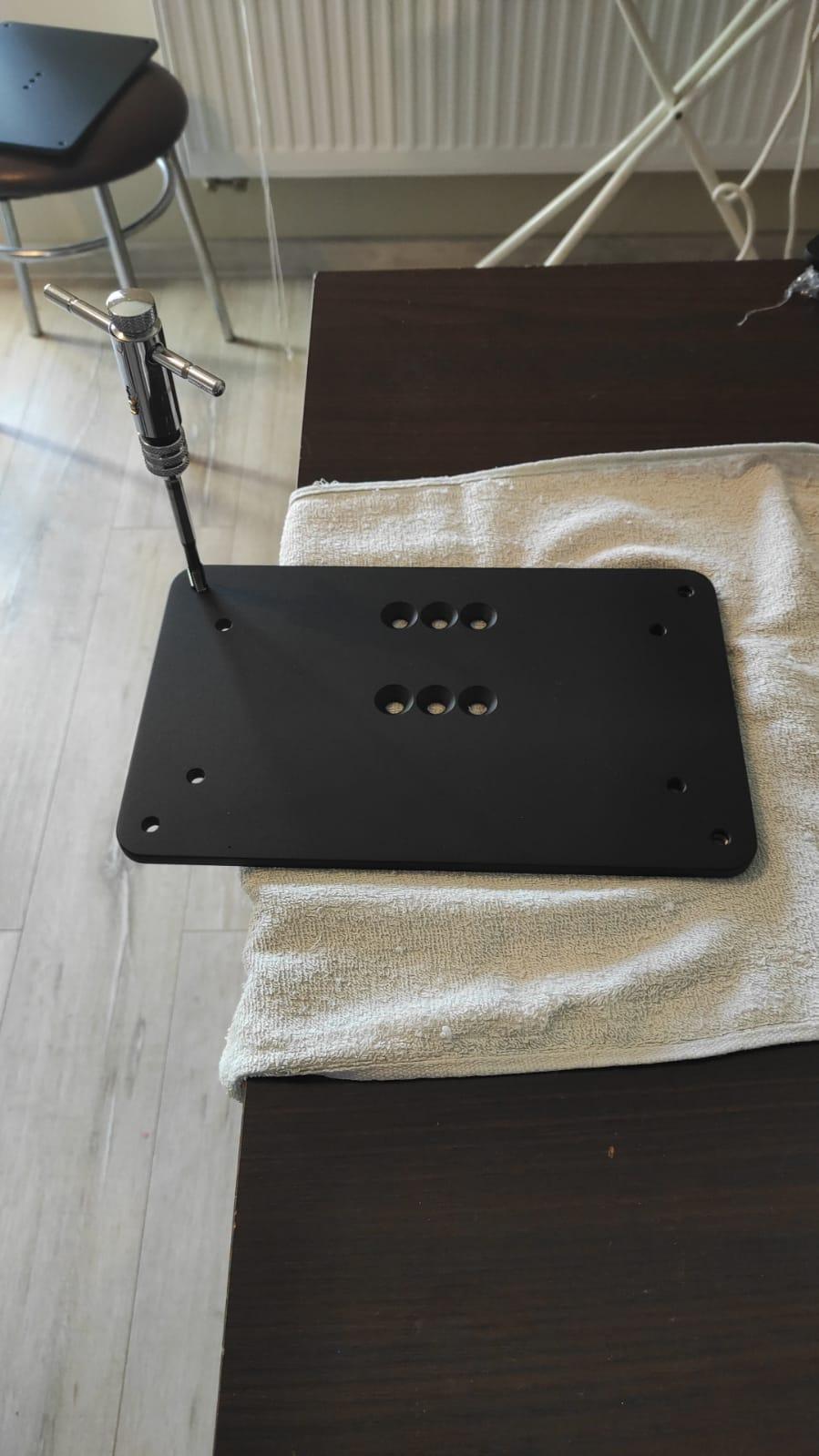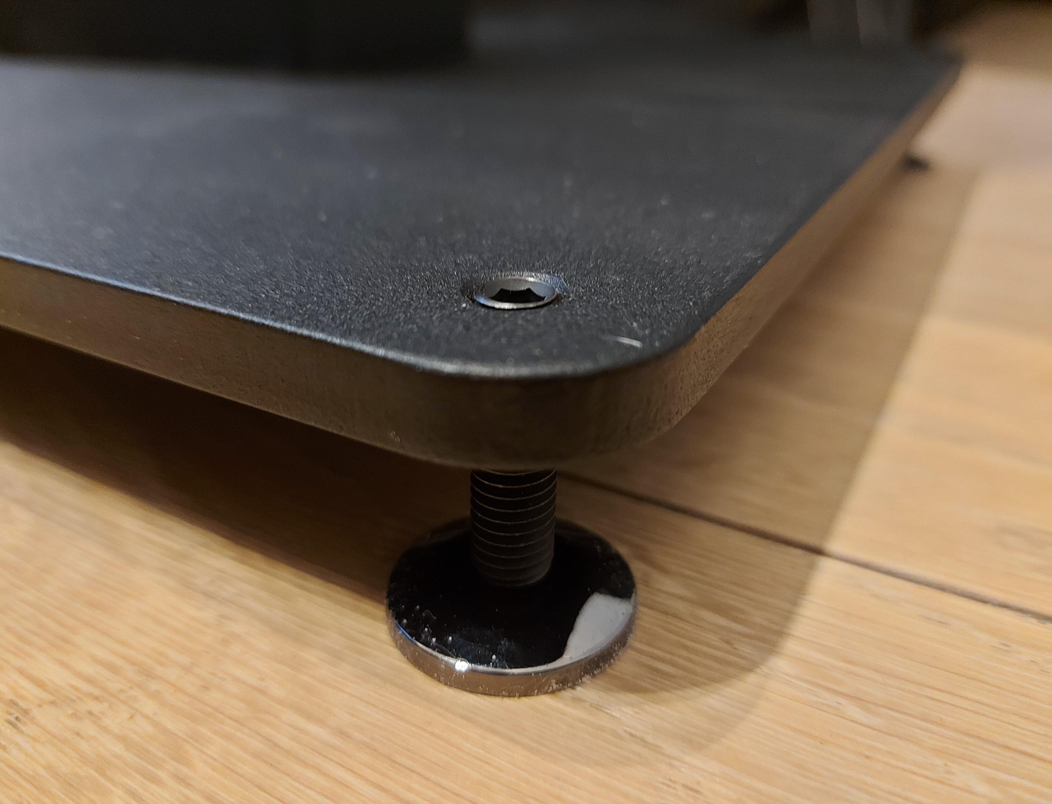 • Kilka fotek... Górna półka daje dwie pozycje mocowania szpilek - szeroko i wąsko,a w komplecie szpilki ostre i płaskie + wkręty dla pasujących kolumn (np Monitor Audio można przykręcić na sztywno i chyba Pylony też?),  możliwe też zamontowanie kółek na dole. Zależało mi na odsunięciu kolumn od ściany (samych standów się nie da odsunąć) To jest raczej waga ciężka. Te podstawy trudne do podniesienia jedną ręką. Kawał żelastwa. A zarazem podkładki mają jakiś taki fajny lakier, że nie rysują podłogi i dość łatwo je przesunąć przód-tył Tu standardowe modele, długość i inne opcje na życzenie.  Tu moje "inne opcje". Dwie możliwości mocowania górnej półki: symetrycznie i skrajnie. U mnie to zadziałało naprawdę dobrze. A na żywo wygląda lepiej.
