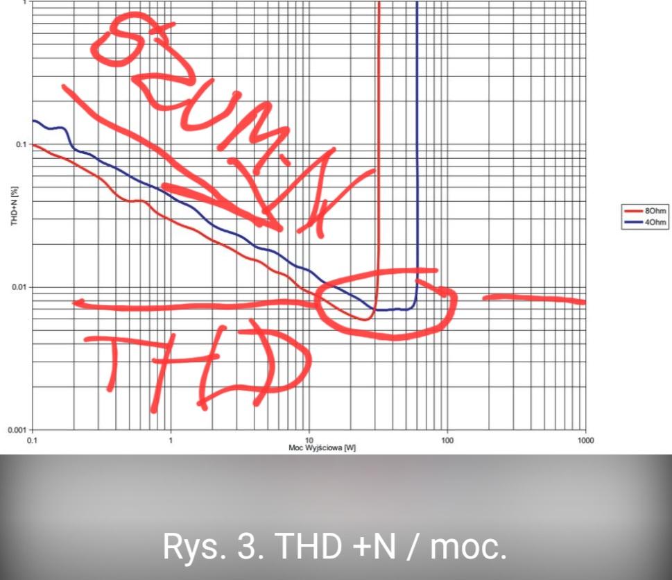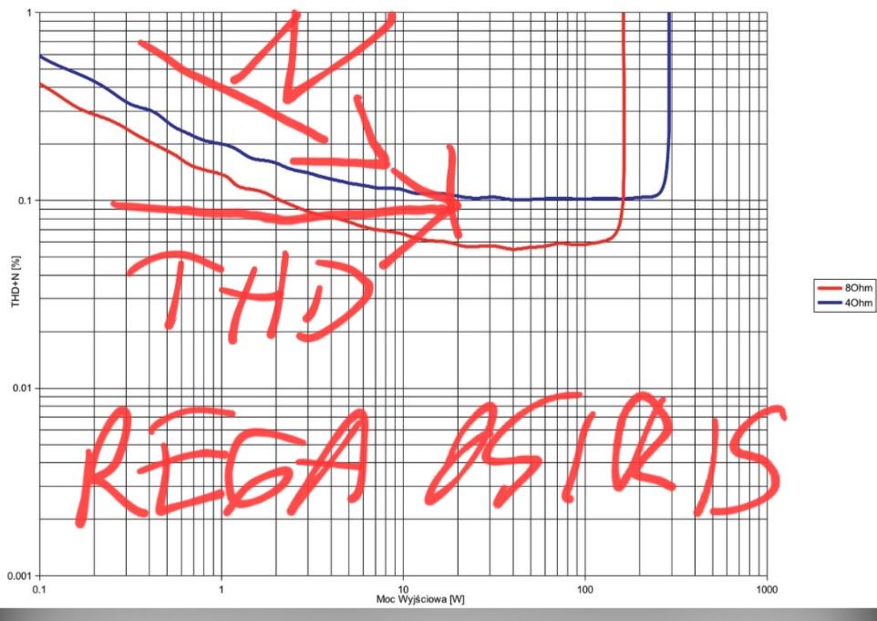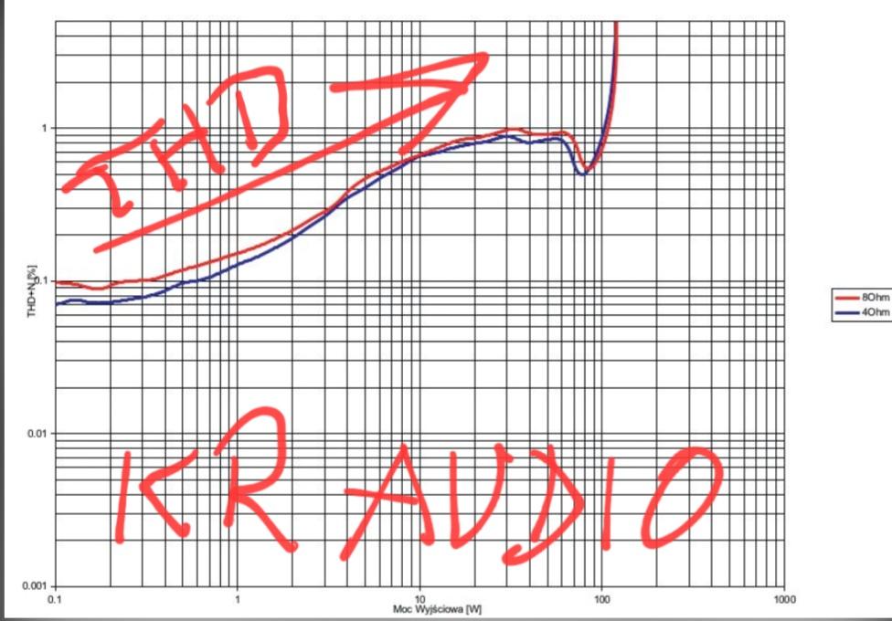 Naturalne brzmienie, ale czy nasycone? Charakterystyka THD+N w funkcji mocy. Szum maskuje THD do ok. 20W. THD to linia pozioma, opadająca to dominacja szumu nad THD. Jak niby by mial brzmieć? THD w normalnym słuchaniu bez wpływu na brzmienie. Naturalny? Tak. Nasycony? Nie. Chyba, że słuchasz za mocą powyżej 20W. Rega OSIRIS. THD zaczyna dominować nad szumem już od 10W. Nasycone granie? Tak. Od ok. 10W. Naturalne? Możliwe. Lampowy KR Audio. THD ponad szumem od 0.1W. Szum nic nie maskuje. Nasycone granie? Totalnie. Naturalne? Nie wiem. Na pewno eufoniczne 😉 Pozdrawiam. M