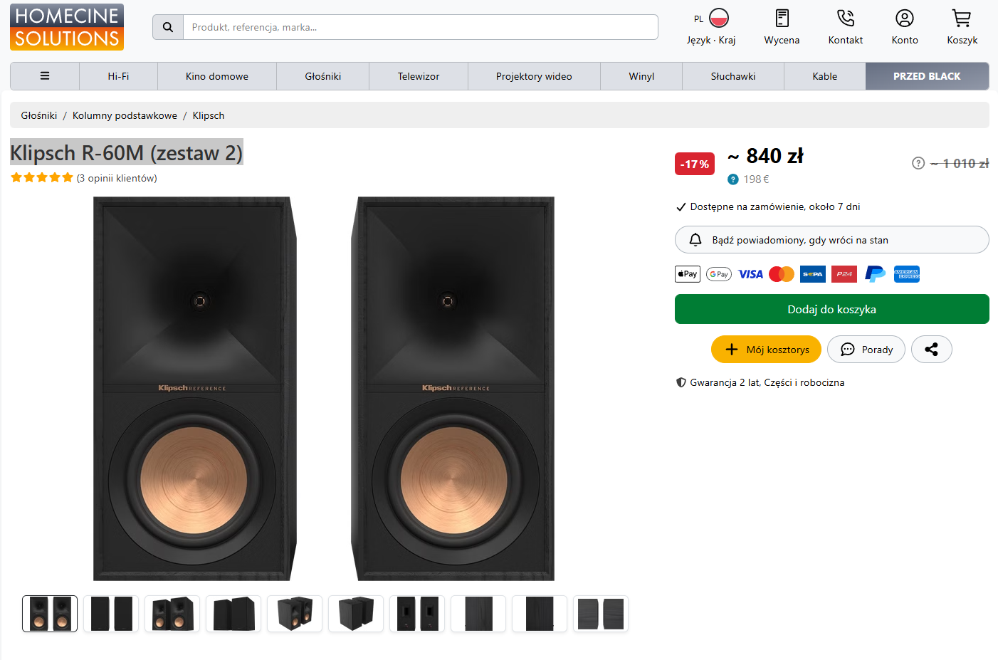 Klipsch R-60M (zestaw 2) - za około 840 zł + 120 zł przesyłka. Na zamówienie. Termin 7 dni. klipsch-r-60m