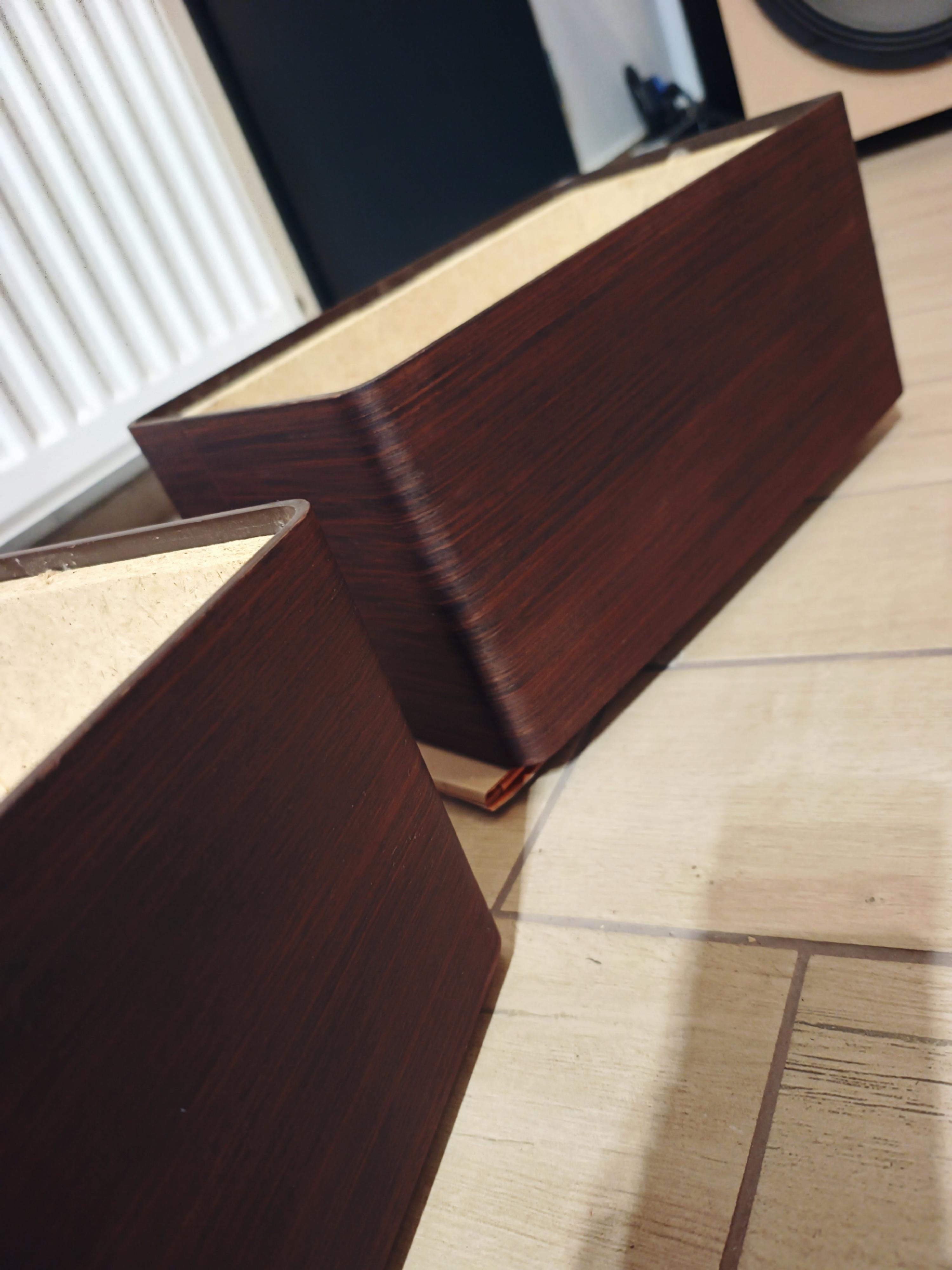 Paczuszki dostały nowy fornir. Wybarwiony wiśniową bejcą i wykończony woskiem. Wyszedł chyba całkiem przyjemny dla oka kolor. Jutro wycinam tylne ścianki, wymieniam kondy w zwrotce i będzie można składać to w całość