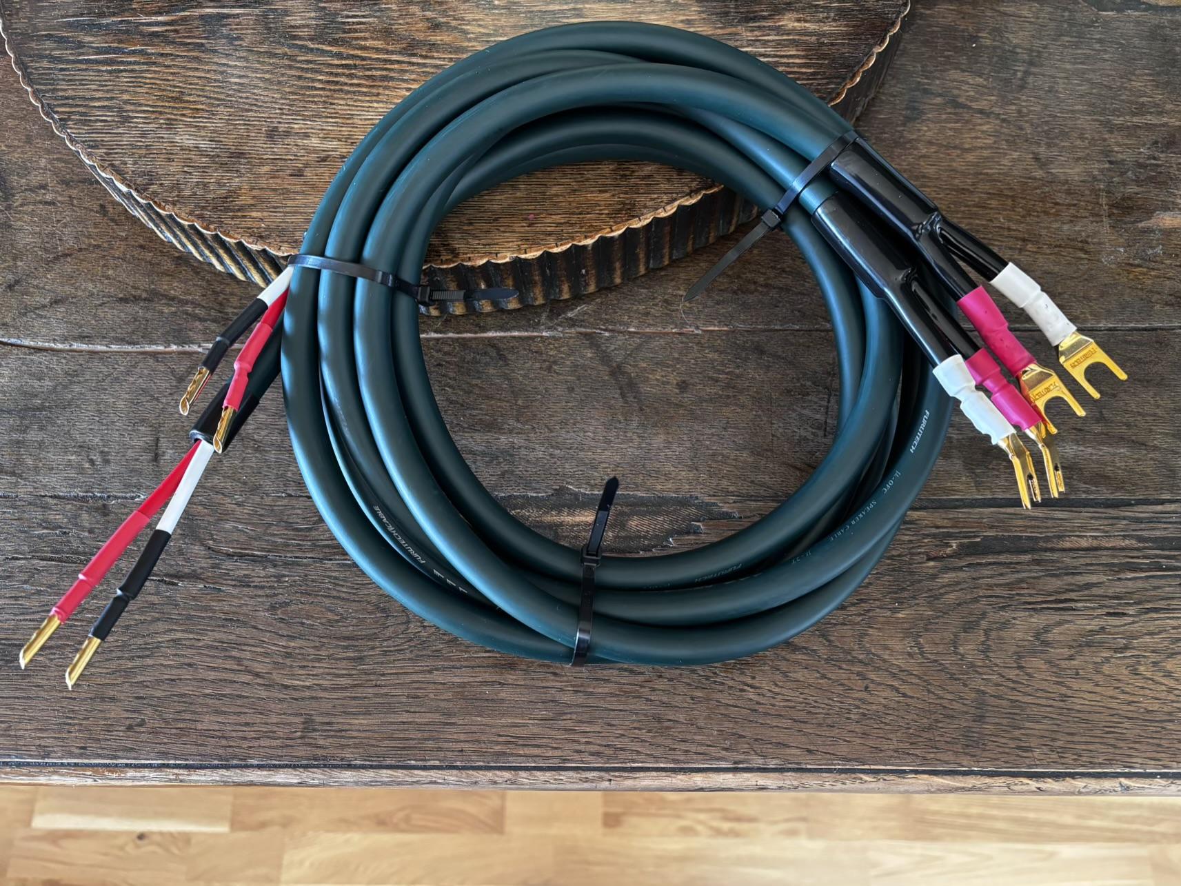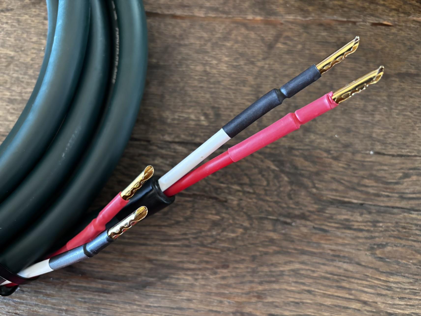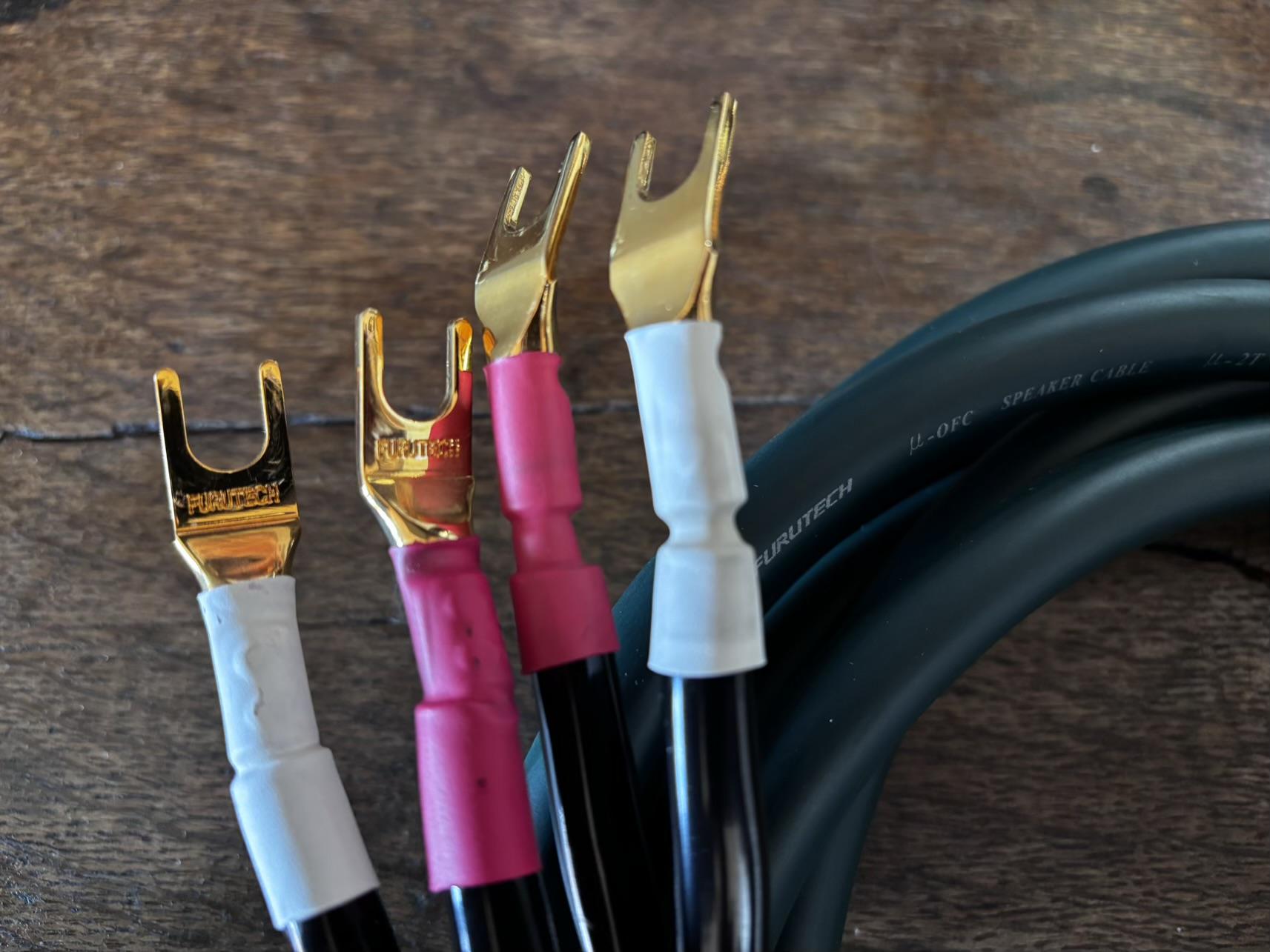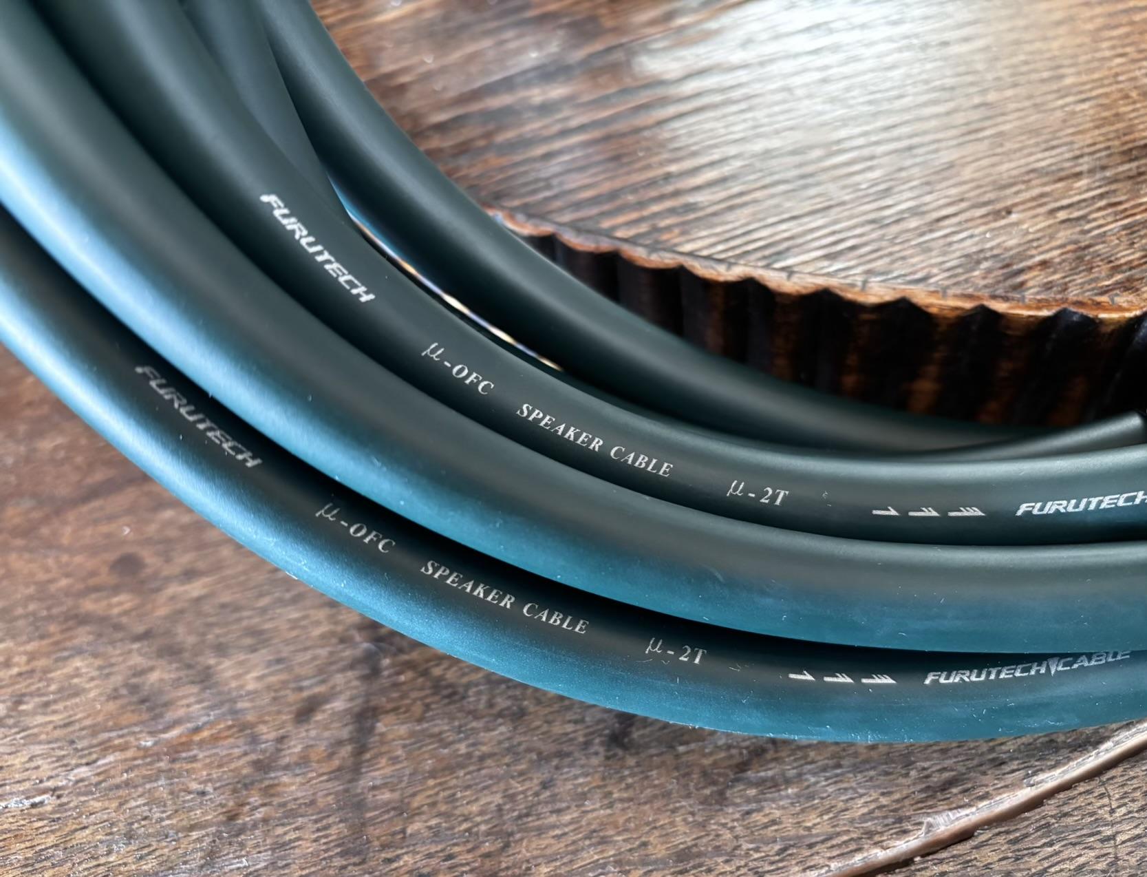 Kable głośnikowe Furutech µ-2T o długości 2x2,3 m, konfekcjonowane widłami Furutech FP-201 G (od strony kolumn) oraz bananami Eagle Cable Hollow Banana z miedzi berrylium, lutowane cyną WBT z dodatkiem srebra. Furutech µ-2T charakteryzuje wyrównany balans tonalny, w testach zwraca uwagę głęboki bas, ładna średnica i góra wolna od sybilantów (co potwierdzam). Kable są wygrzane. Oddam za 850 zł plus paczkomat.