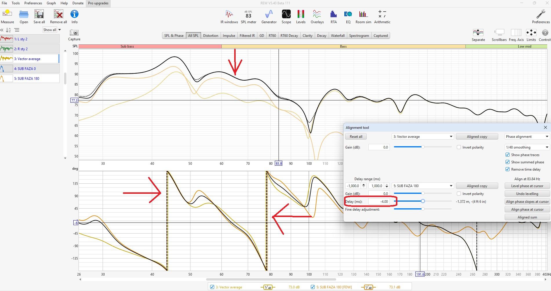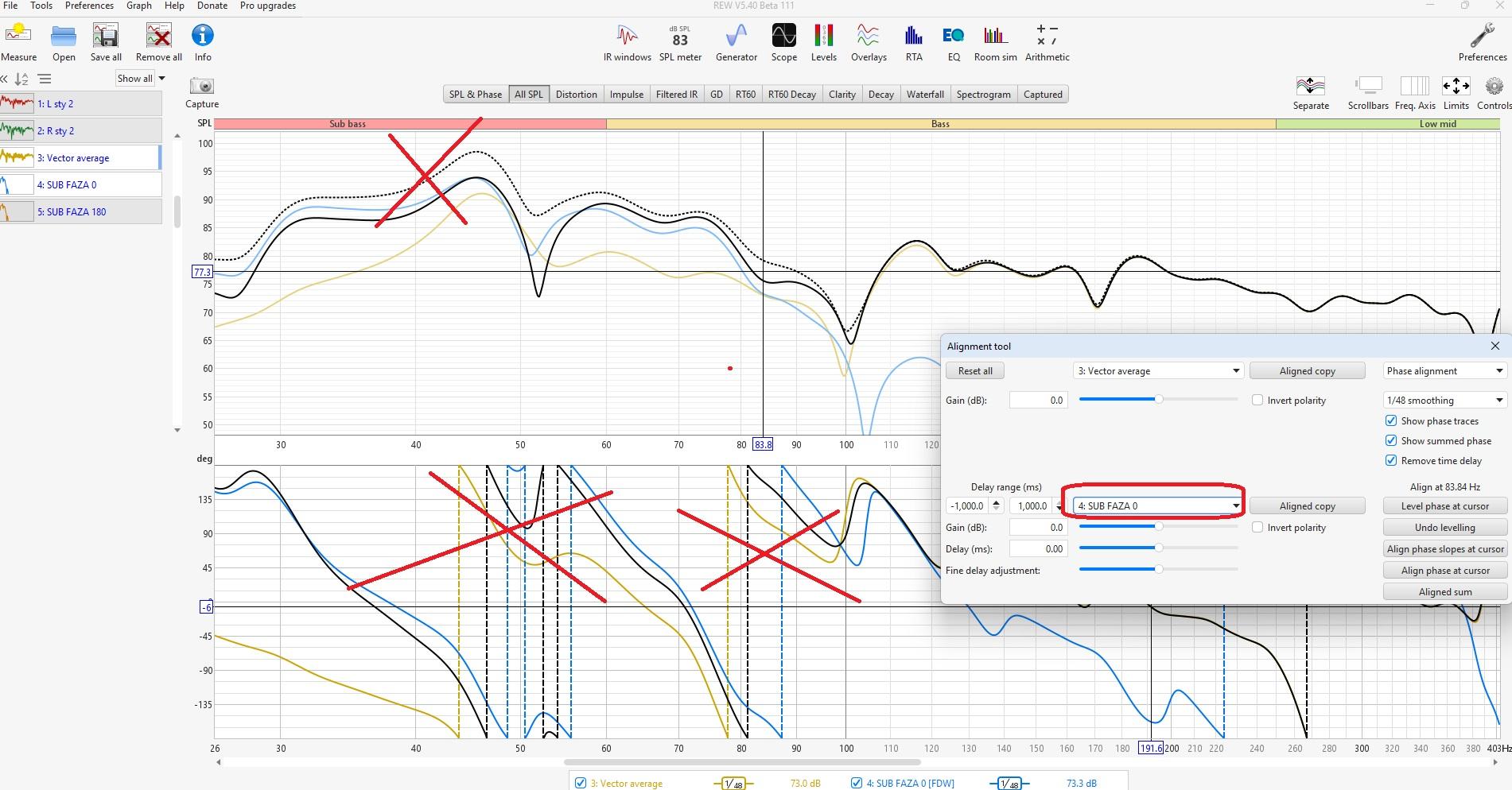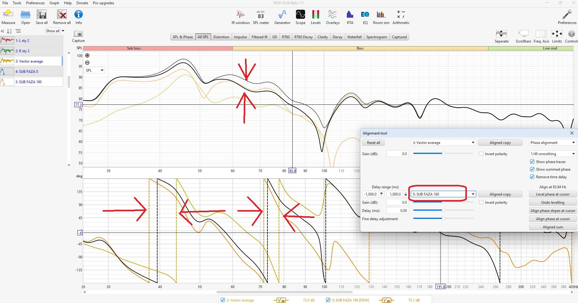 W tej konfiguracji faza 180 jest poprawna, ale żeby sub był zgrany w 100 % z kolumnami LiP (vector average) to powinien być opóźniony 4ms w DSP w stosunku do kolumn lub przestawiony w troszku inne miejsce. Może zostać bo jest z grubsza OK, ale jeszcze bym powalczył Pozdrawiam. M