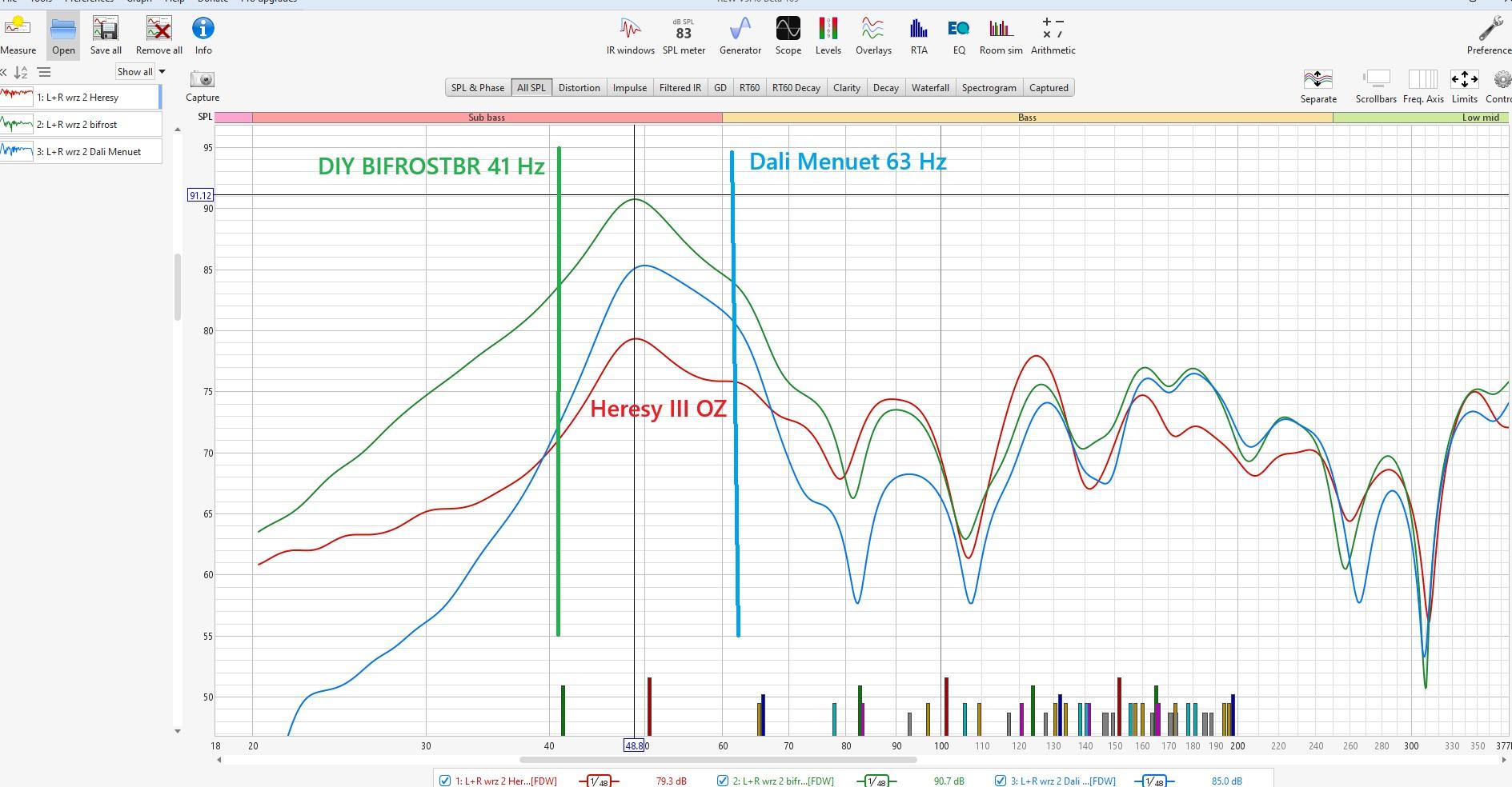 Na przykładzie trzech kolumn dokładnie widać z czym walczymy i kto rządzi niskimi częstotliwościami DIY BIFROST strojenie BR jest na 41 Hz. Dali Menuet strojenie BR 63Hz. Heresy OZ. Pomieszczenie nic sobie nie robi z tego tylko wybija rezonans na 48 Hz i czy jest to mały monitor czy duży monitor pomieszczenie rządzi. Rolowanie pasma nie następuje po częstotliwości strojenia BR tylko wtedy kiedy pomieszczenie pozwoli. Jest pik na 48Hz i spada do kolejnego moda w wykopanym przez falę stojącą "notch`u". Dali powinno się zawijać wcześniej ale gra za nie jeszcze pomieszczenie do 48 Hz. Bifrost powinien sięgnąć dalej ale pomieszczenie nie pozwala. Dodając suba ile ugramy i kiedy? Żeby nie było fali stojącej od kolumn i piku na 48 Hz i dipa na ok. 42 Hz to trzeba im pasmo od ok. 80 Hz zabrać. Może wcześniej. To straszny kompromis będzie, bo SUB może odda dół pasma ale przecież gdzieś zabierze Pozdrawiam. M