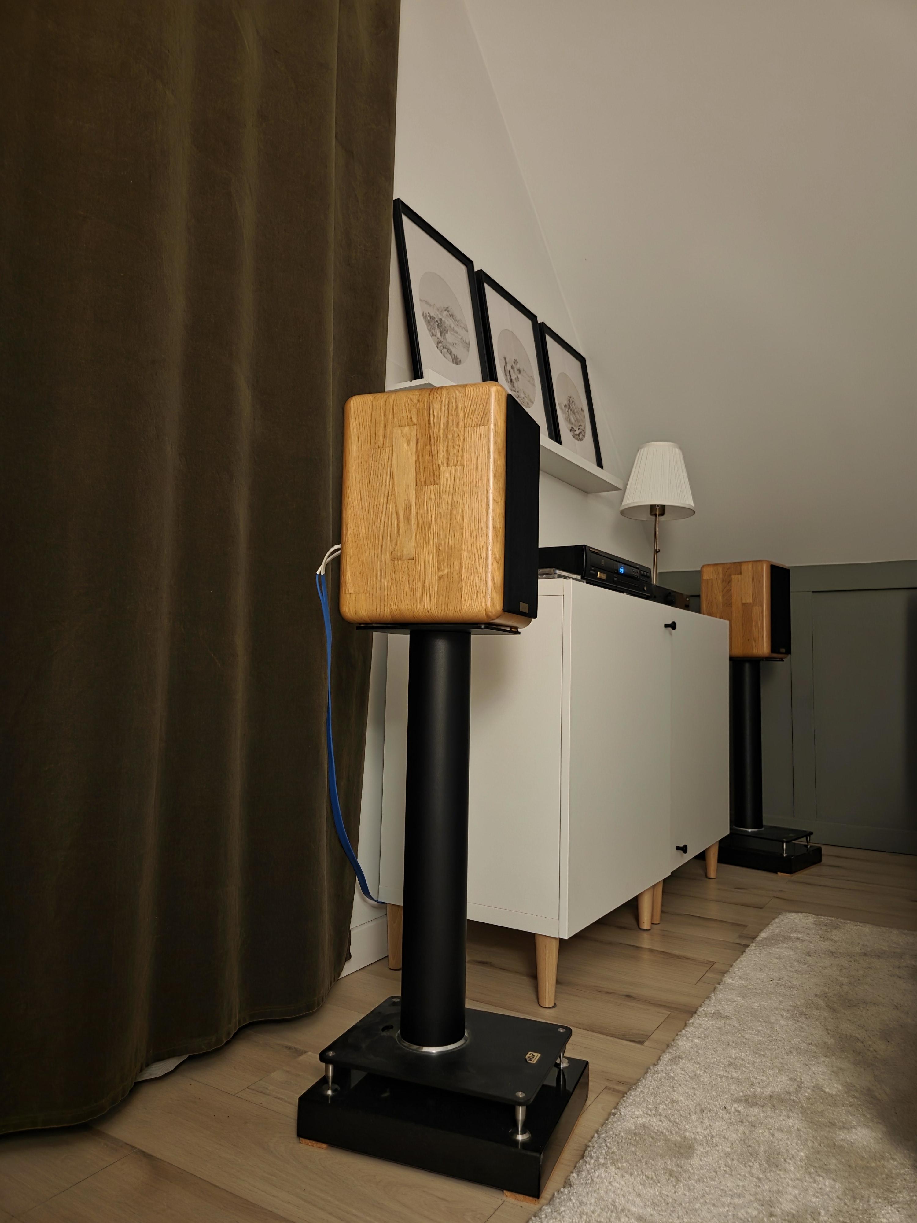Hej, Po niespełna dwóch latach w małym pokoju ( niecałe 9 m²) przeniosłem system do sypialni o powierzchni ok. 18 m² ( 4,1x4,4). Dzieci szybko rosną, każde z nich chce mieć swój pokój, a w salonie świetnie się spisuje soundbar. Samo pomieszczenie okazało się jak zawsze sporą zmiana w brzmieniu. W małym pokoju dźwięk był bardzo bliski, intensywny, wręcz intymny – wszystko działo się tuż przed słuchaczem. Miało to swój urok, byłem do tego przyzwyczajony, a nawet lubiłem taką prezentację. Basu było trochę mniej, oceniłbym go jako szybki i punktowy, ale pozbawiony masy i głębi, co wynikało wydaje mi się z ograniczonej kubatury pomieszczenia. Po przenosinach do sypialni brzmienie zestawu, w niektórych aspektach wyraźnie się zmieniło. Scena otworzyła się na szerokość, przekaz jest spokojniejszy, bardziej uporządkowany. Bas pojawił się w większej ilości, jest głębszy i pełniejszy. Zrobiłem pomiary, które zamieszczę do wglądu w odpowiednim dziale. Dodam jeszcze, że najbliższe plany to zapełnienie regałów na płyty (zostało miejsca na ok. 100 sztuk) oraz być może zakup subwooferów, które ostatnio cieszą się dużą popularnością na forum. Jakby co można kąsać, przeżyję