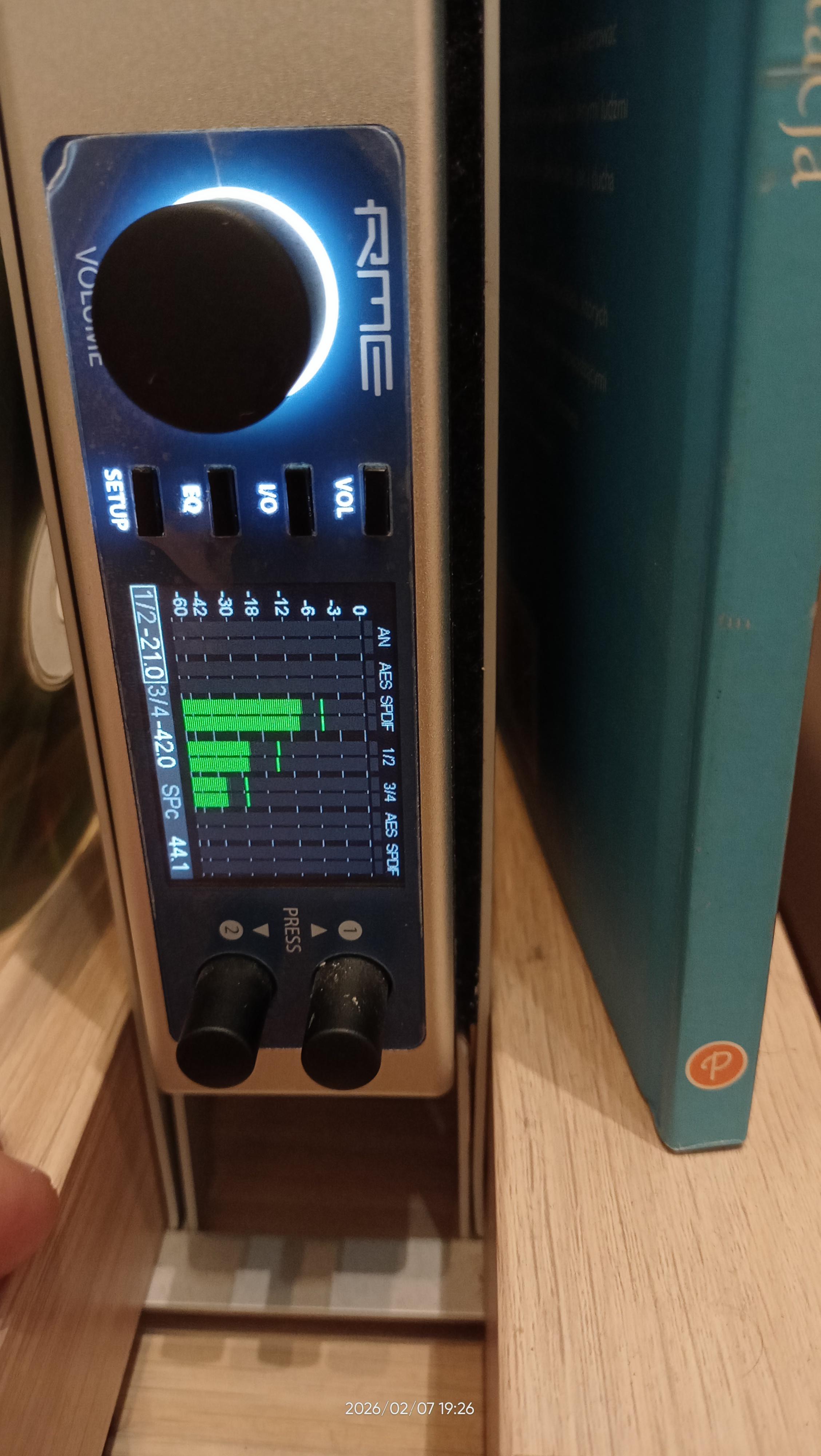 Powód dla którego Wiim Pro plus wydaje się gorszy od większości transportów cyfrowych jest banalny. U mnie w porównaniu do cedeka Pioneer PD-30AE jest o 5dB cichszy na wejściach cyfrowych daka Rme Adi-2 Pro fs. Maksymalny sygnał cyfrowy na wejściu Rme z Wiima to -5dB. Seryjny, budżetowy cedek Pioneer PD-30AE dobija do 0dB. Już jeden dB więcej powoduje odczucie lepszego brzmienia, a pięć to średnio 1 i 2/3 raza głośniej. Więc nie dziwi, że cichszy Wiim wypada odsłuchowo słabiej od głośniejszych źródeł cyfrowych. Zapytam support Wiima, dlaczego wyjścia cyfrowe są cichsze o średnio 5 dB, od budżetowego odtwarzacza CD Pioneera. Foto pokazuje poziom wejściowy sygnału cyfrowego z Wiima Pro Plus. Foto z dobijającym stale do zera sygnałem z Pioneera nie daje się załadować. Różnica poziomu sygnału jest stała, niezależnie czy po Coaxialu, czy Opticalu, wynosi 5dB.