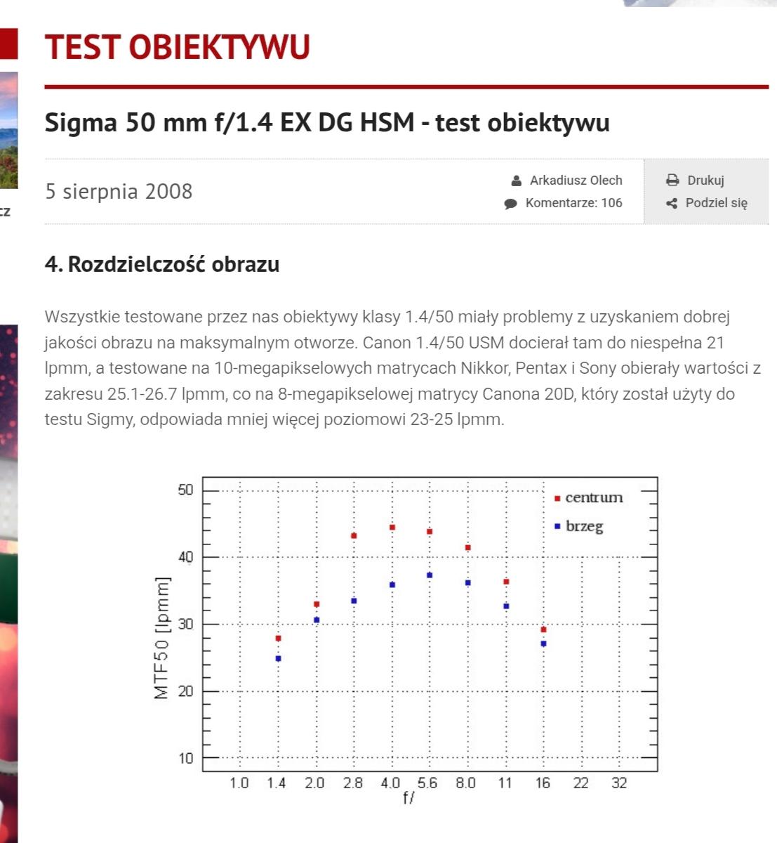 Witek, Ty mówisz o branży profesjonalnej, a ja o dostępnych szkiełkach dla mas, bo o tym była mowa popularność sprzętu itd. Spójrz na rozdzielczość szkieł nie z serii pro i jak wypada Sigma w centrum(kadru) osi obiektywu. Oczywiście rozmiar matrycy tutaj też ma wpływ, czy podepniemy szkółek APS-C, czy FullFrame. Oczywiście ważne są jeszcze inne parametry szkieł, jak aberracja chromatyczna i inne. Ale dziś matryce naprawdę potrafią i wymagają od szkieł trochę więcej niż w czasach błon fotograficznych. Zobacz co robi Sigma z Canonem i Nikkorem w przedziale f2.8÷f5.6. Mnie w przypadku Jarka nie dziwi, dziwi mnie, że to Ciebie jeszcze dziwi... 😁😁😁