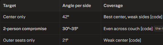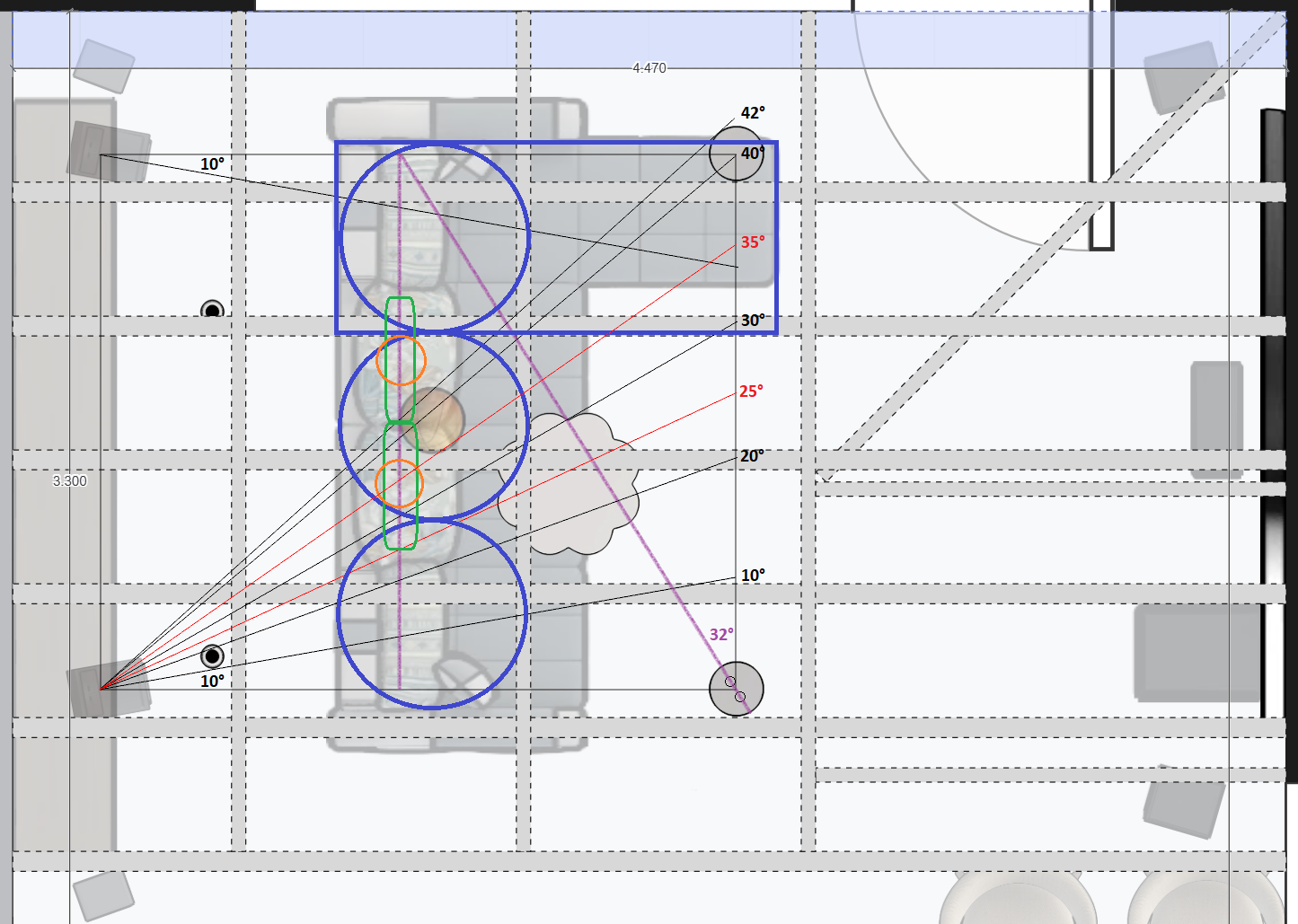 Zapytałem AI o kąty przy odsłuchu na 2 osoby.. nawet wygenerował sobie jakiś skrypt do liczenia i przedstawił tabelkę "Quick angle calc table This setup prioritizes your most common 2-person use while keeping solo center viewing solid." Więc nabazgrałem sobie 2 osoby (pomarańczowe kółka to głowy), kąty i jak dla mnie te 30° wygląda na wystaczające. edit: niebieskie elementy do zignorowania 😅