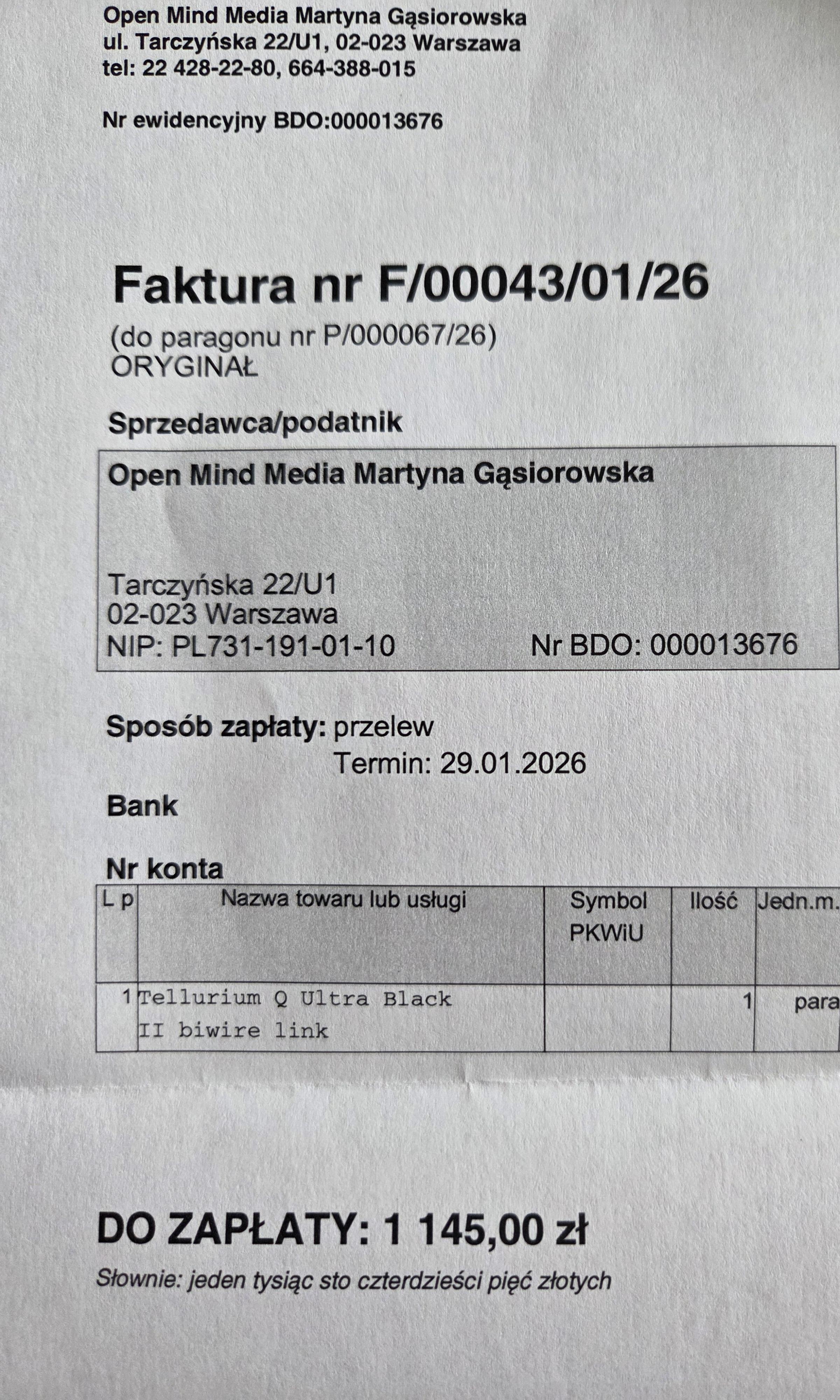2. Przedmiotem sprzedaży są 4 szt. zworek głośnikowych Tellurium Q Ultra Black II Jumpers (4x 30 cm) Konfekcja banan - widełki Zworki w stanie idealnym (jak nowe), kupione w polskim salonie audio 21.01.2026 (dowód zakupu, gwarancja) Cena okazyjna 899 zł + wysyłka paczkomatem GRATIS Oferta dostępna w OLX: https://www.olx.pl/d/oferta/tellurium-q-black-ii-jumpers-zworki-do-kolumn-4x-30-cm-jak-nowe-CID99-ID19kZWN.html