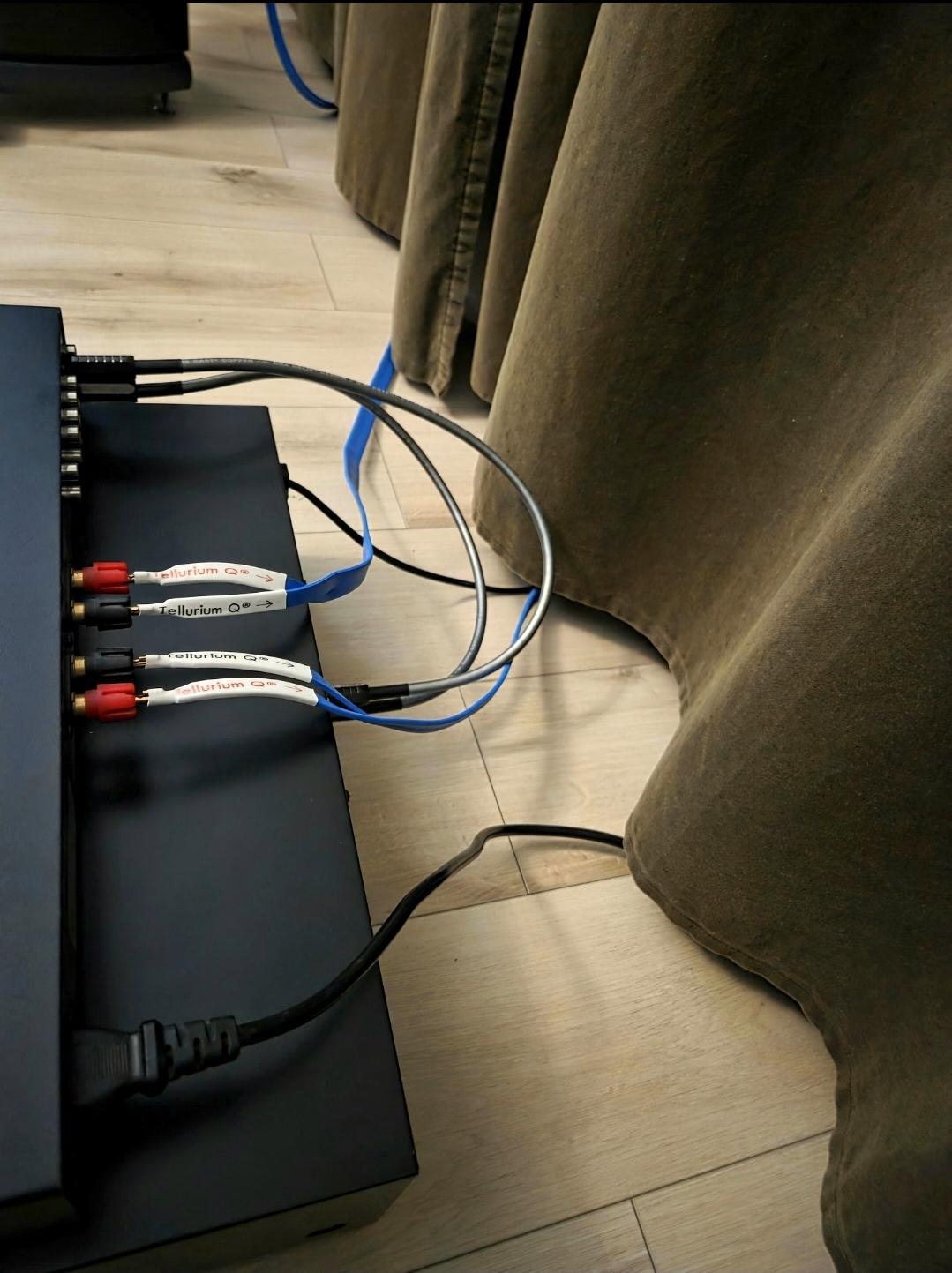 Jak widać na zdjęciu jest porządek, a kabelki ładnie poprowadzone 😀. Powoli dochodzę do wniosku, że muszę zmienić kable głośnikowe na dłuższe. Nie chcę, żeby sprzęt stał na podłodze, a tylko przy dłuższych kablach będę mógł postawić wzmacniacz i odtwarzacz CD normalnie na szafce. Zauważylem, że audiofilskie systemy czasami już tak mają, że wzmacniacz i kolumny stoją daleko od siebie 😉