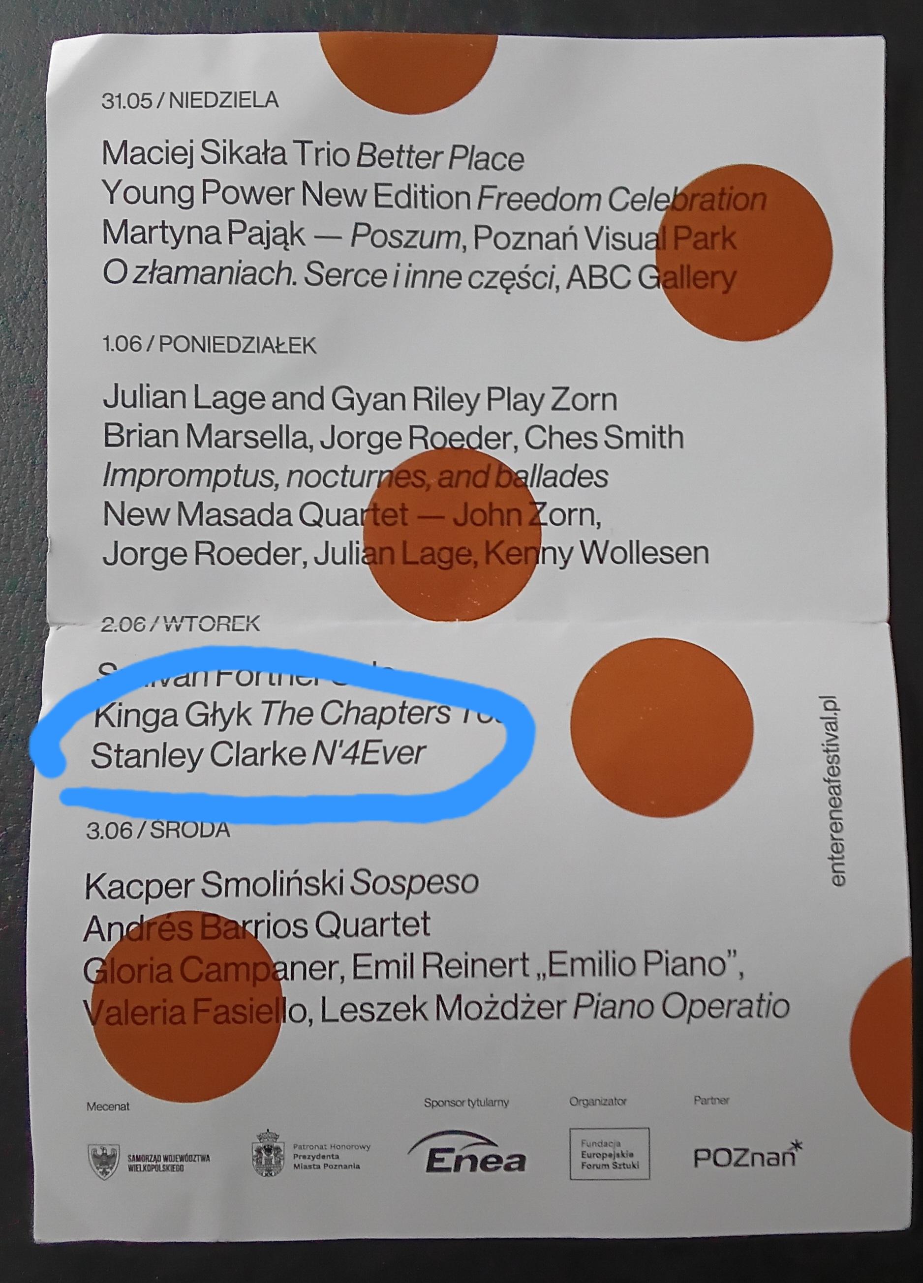 Wreszcie pojawił sie lineup Enter Enea Festival. To znaczy wreszcie go znalazłem w portkach przed praniem...😁 Zorn w roli głównej....🤔, może być lekko i ko(s)micznie 😉, a może być niestrawnie ciężko... Czekam na dzień 3. Obstawiam, że zobaczymy spontaniczny duet na dwie gitary basowe Clarke/Głyk.... to by było coś! Bilety oczywiście drogie ale jak słyszę ile moje córki są gotowe wydać na letnie festiwale, to myślę, że nie jest wcale tak źle 😄