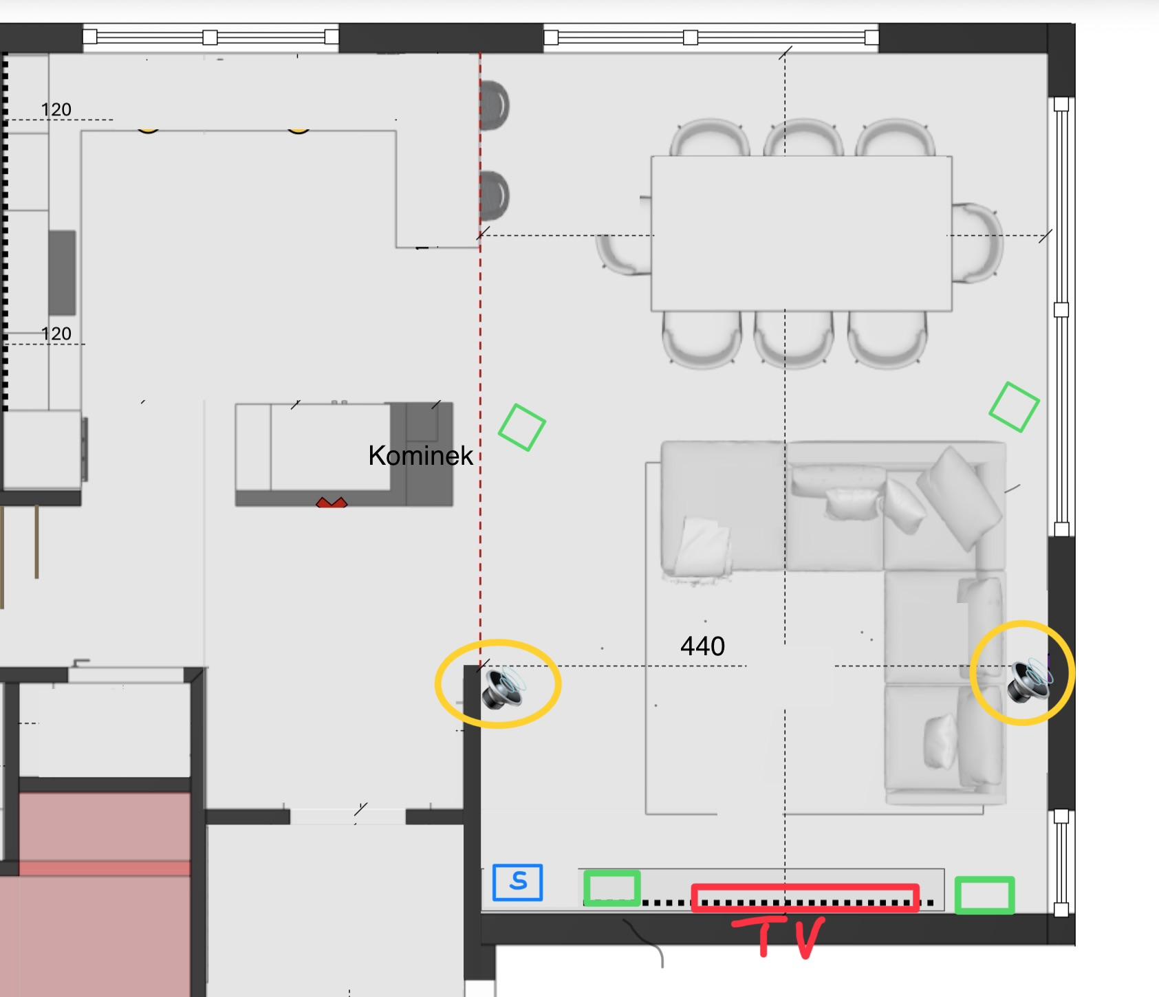 Cześć i pozdrawiam wszystkich serdecznie, Proszę o poradę czy zestaw nad którym myślę będzie dobrze dobrany do pomieszczenia i jak w miarę możliwości te kolumny sensownie rozmieścić ? Dom jednorodzinny, salon 30 m2 - wysoki sufit Aktualnie w obecnym mieszkaniu o mniejszych gabarytach użytkuję * kolumny głośnikowe Monitor Audio Bronze 2 na podstawkach, * Monitor Audio bronze center, * Kolumny surround Monitor Audio Bronze FX, * Subwoofer JBL. W planach po przeprowadzce planuje ulepszyć zestaw z racji większego salonu na: * Monitor Audio Silver 500, * Monitor Audio Silver C250, * SVS SB2000 PRO Subwoofer Z racji układu pomieszczenia ciężko tu zamontować Monitor Audio FX - ewentualnie czy one mają sens bycia w miejscu zaznaczone kółkiem koloru żółtego? Kolumny surround aby ograniczyć budżet chciałbym wykorzystać Brozne 2 na podstawkach, które już mam. Kolumnę koło kominka będą musiał cały czas przestawiać, no chyba, że ktoś tu widzi jakieś inne sensowne rozwiązanie? Amplituner już zakupiłem w tym roku - Denon X3800h. Przeznaczenie kino / muzyka. Dolby Atmos - co my myślicie na tym wysokim suficie? Jakieś możliwości, rozwiązania, czy nie brać pod uwagę? Proszę o poradę co do rozmieszczenia głośników, opinie nt zestawu, czy będzie odpowiedni co do wielkości salonu. Nie ukrywam, że obawiam się trochę tego wysokiego sufitu jak to ze sobą współgra.. Tv 65/77 cali, odległość do sofy około 350 cm. Zdjęcia poglądowe, plan oryginalny zmodyfikowany - TV zaznaczony kolorem czerwonym (na szerszej ścianie). Z góry dziękuję za pomoc i wszelkie uwagi.