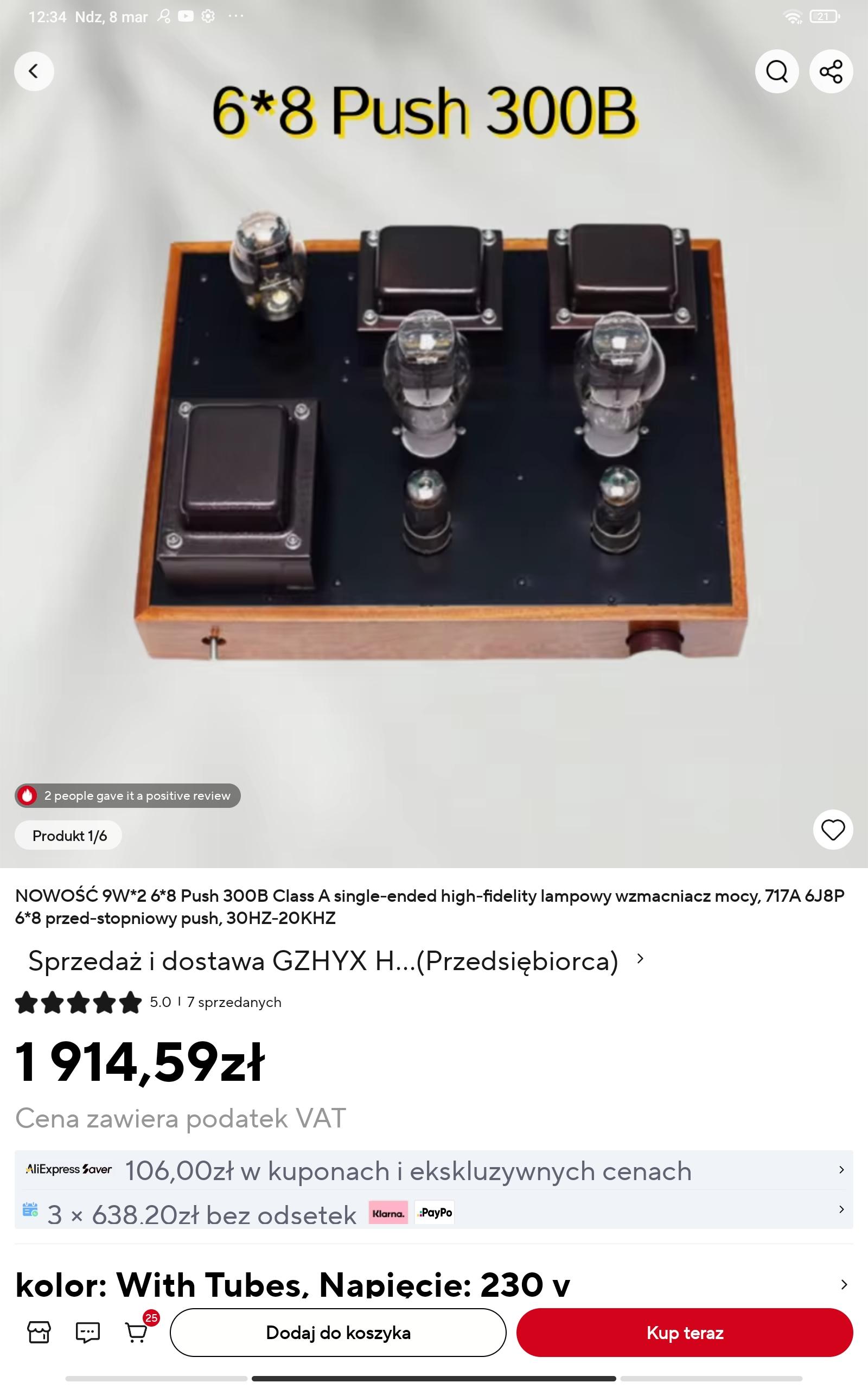 Tak więc na dobrą zabawkę obecnie nie będzie mnie stać. Wiem że sporo ludzi na forum jest uczulona na chiński sprzęt,ale udało mi się znaleźć coś takie,dodatkowo by wystarczyło na jakieś drobne modyfikacje. Właśnie udało mi się znaleźć to na AliExpress: NOWOŚĆ 9W*2 6*8 Push 300B Class A single-ended high-fidelity lampowy wzmacniacz mocy, 717A 6J8P 6*8 przed-stopniowy push, 30HZ-20KHZ https://a.aliexpress.com/_EI7pRNS -