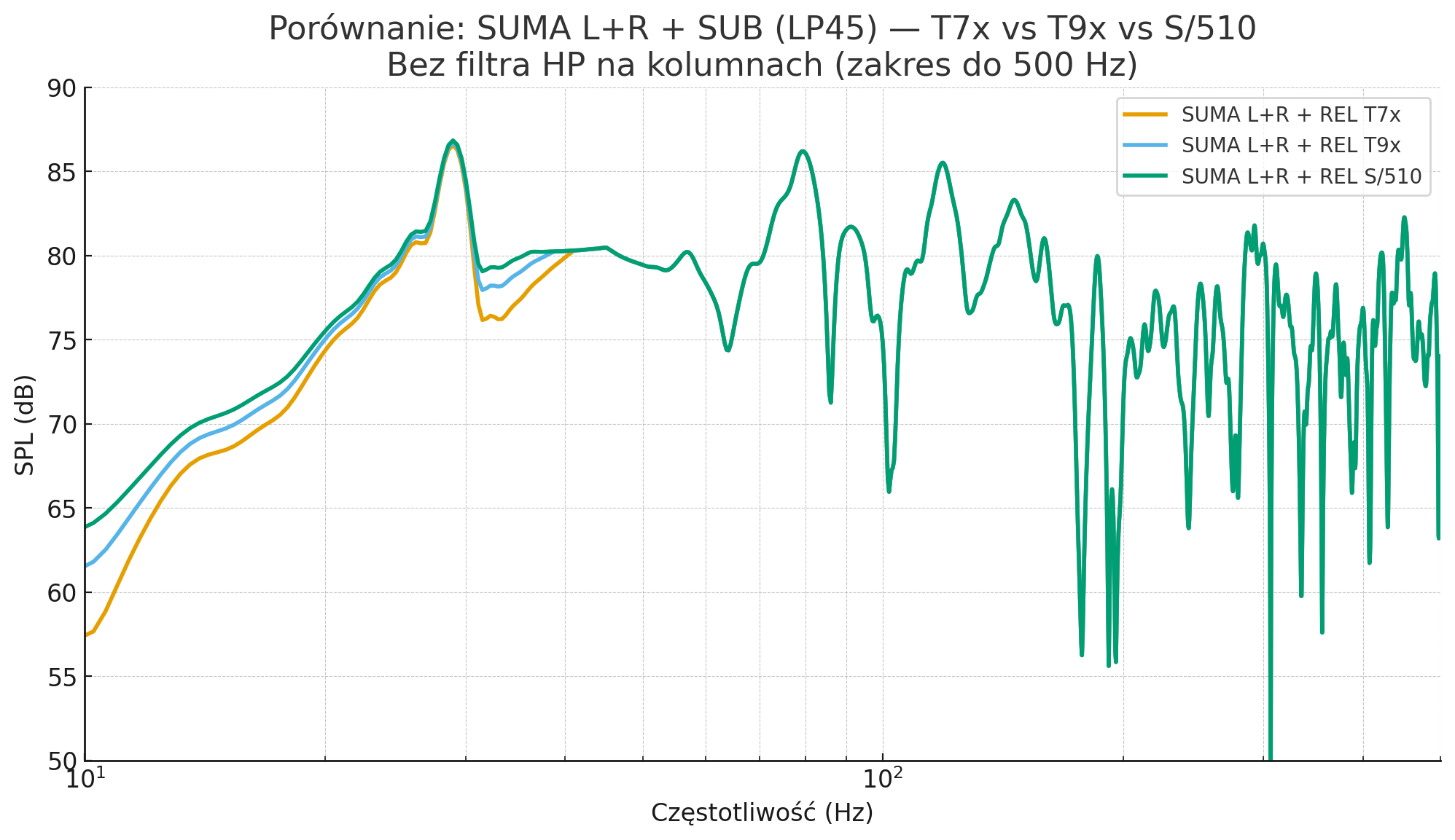 A oto wynik pracy z chatem gpt. Traktuje go jako zabawe, ale kto wie jak beda wygladaly pomiary rzeczywiste? Opis: "suma R+L" to po prostu spl pokoju na samych kolumnach. Trzy warianty przewiduja odpowiednio dodanie rel t7x, nastepnie rel t9x i ostatecznie wersja premium rel s/510.