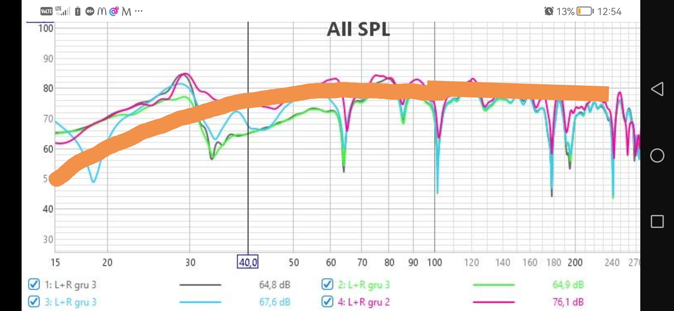 To samo było u mnie, tylko gorzej. W najlepiej brzmiącym ustawieniu podbijał mi mod na 52Hz i wycinał prawie wszystko poniżej, ale dźwięk był ok (mimo moda dość punktowy), natomiast ustawienie w przeciwfazie do kolumn dawało piękny równy pomiar od 30Hz, ale dźwiek był tak rozmyty i misiowaty że nie szło tego słuchać. Oczywiście też słyszę po której stronie stoi subwoofer bo mi zaburza symetrię i środek sceny