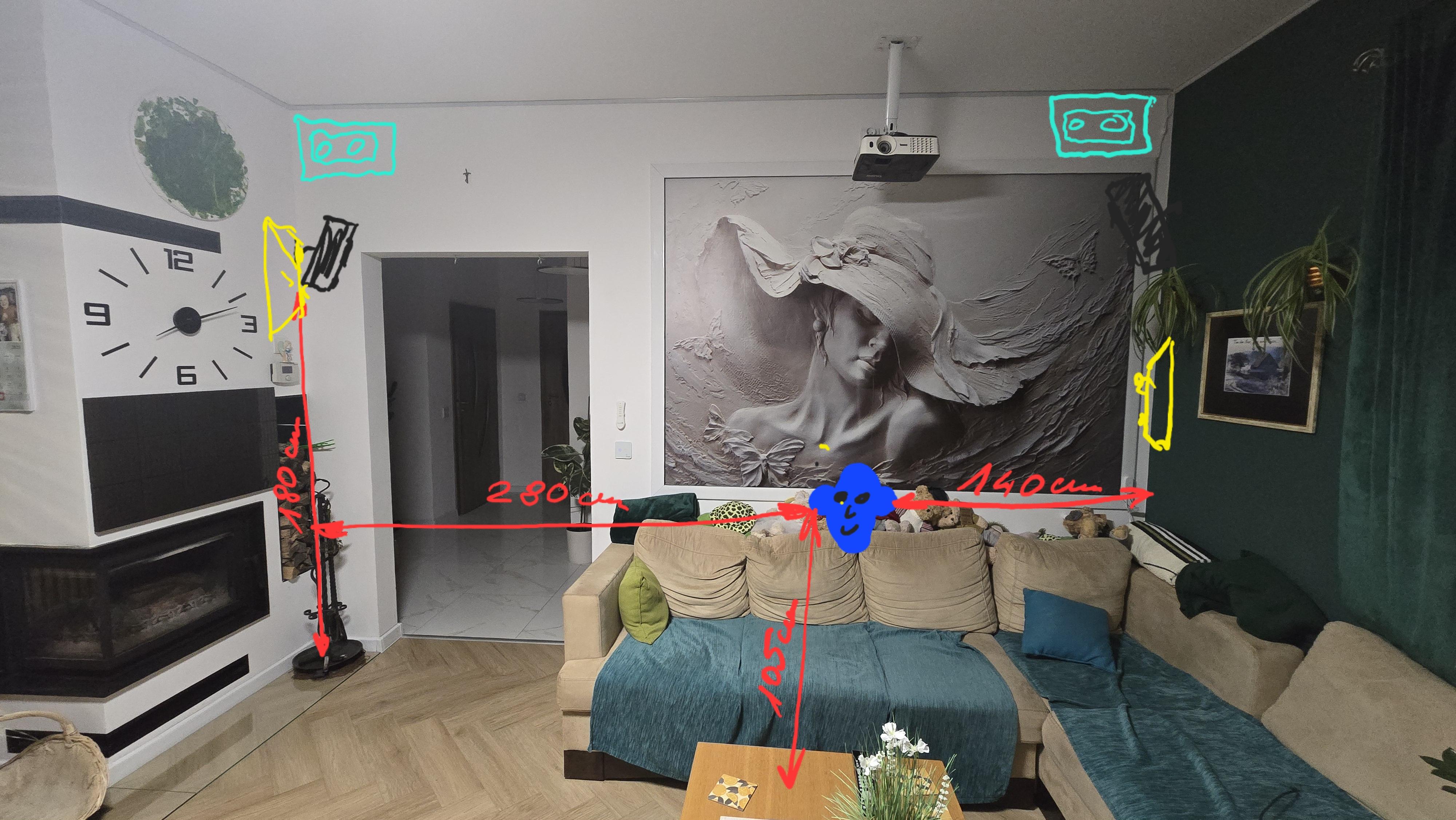 Trochę się pozmieniało, bo ostatecznie zdecydowałem się na Onkyo RZ30 (kupione więc zmian już nie będzie) ale powstał nowy problem, bo nie mam już kasy na nowy dom 🙂 a warunki mam takie jakie mam, więc uważam że straszne jeśli chodzi o głośniki surround. Wstawiam zdjęcie żeby pokazać jak to drastycznie wygląda, a zarazem prosić Was o pomoc bo coś wymyślić trzeba, ale oczywiście zdaję sobie sprawę że w moim przypadku nie będzie dobrej opcji, a "mniejsze zło" Odległości mniej więcej widać, moim zdaniem są trzy opcje (każda zła) 🙂 Czarna , żółta i ta zielonkawa. Oczywiście mówimy o jednej z tych trzech wersji, lub może całkiem coś innego, ale tu moja wyobraźnia i wiedza na temat głośników surround się kończy.