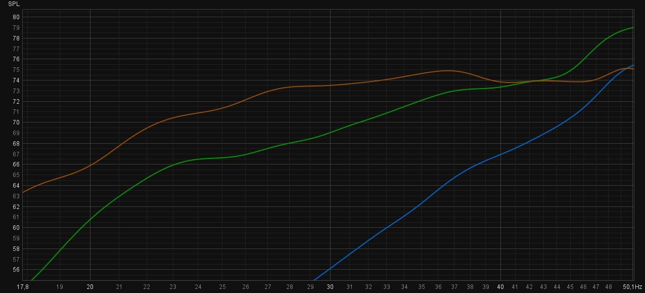 @maciek72 Tak to wygląda aktualnie. Przy 25Hz spadek wynosi -3dB. Volume ustawiony na -15dB (minus 15db). To w przypadku muzyki. Do filmów/gier mam drugi profil z nieco większym doładowaniem. Pomiar z SPL na poziomie 74dB. ■ - same kolumny ■ - z subem bez włączonych filtrów ■ - z subem i włączonymi filtrami