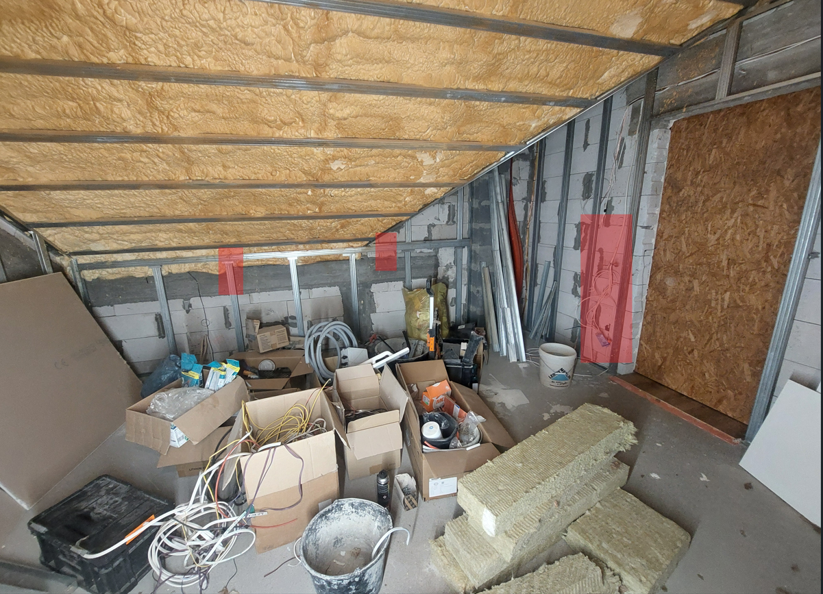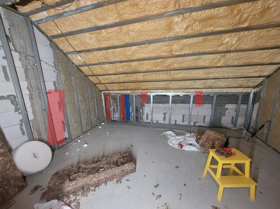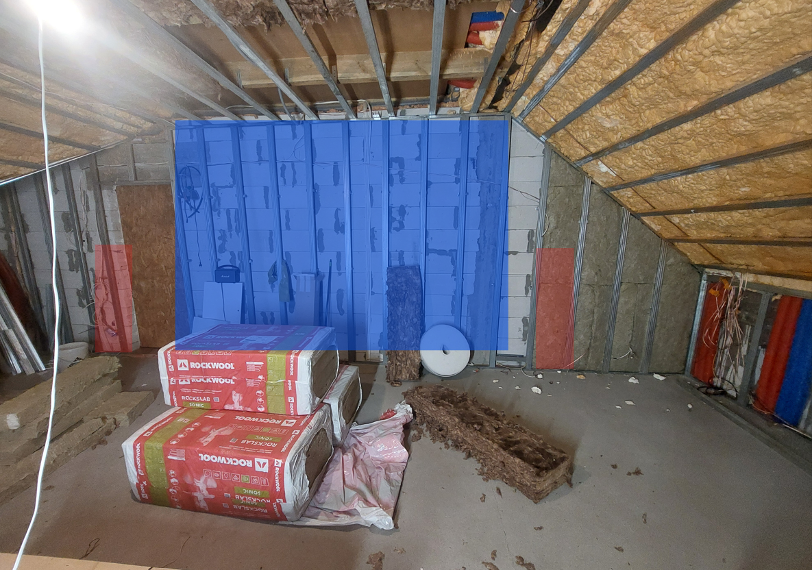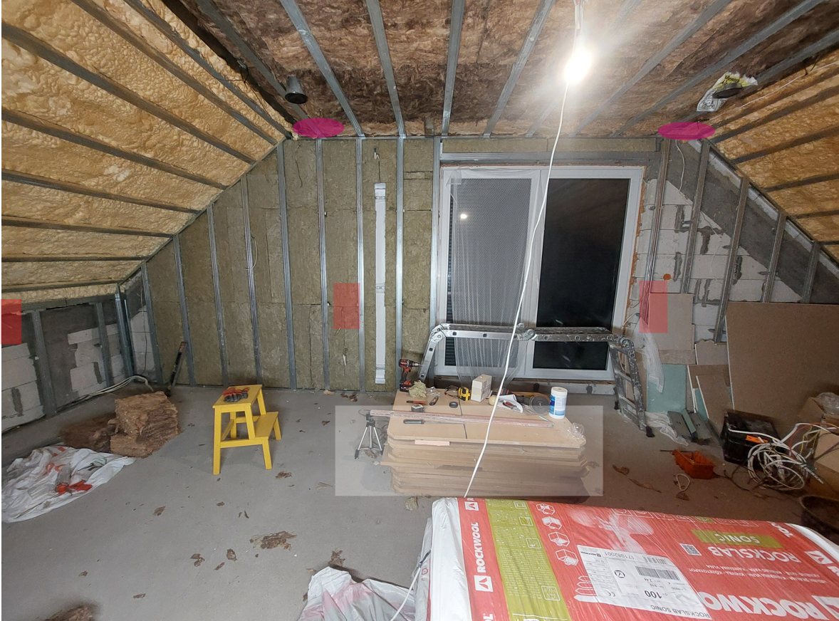 Podczas budowy zleciłem ekipie wykończeniowej wykonanie stelaży pod płyty GK, aby odizolować akustycznie ten konkretny pokój od innych na piętrze. Niestety jak i ja jak i oni nie mięli wiedzy aby dać pod konstrukcję taśmę akustyczną, trudno, zastosuję ją jednak pod same płyty GK, a wszystko wypycham porządnie wełną, mam nadzieję, że ściany grać nie będą. Po części konstrukcja jest "złapana" pianą PUR naniesioną na konstrukcję dachu.